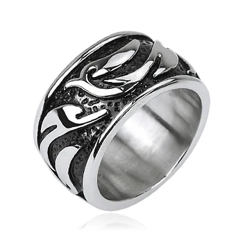 Prsten z chirurgické oceli 316L. Masivní pánský prsten. Prsten má po obvodě plastický vzor na černěném podkladě. Prsten je široký 13mm.