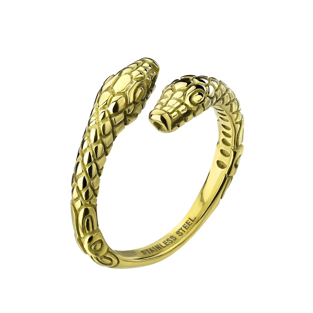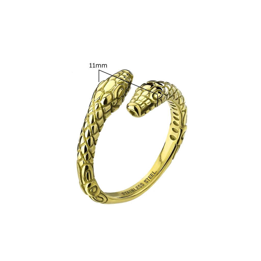 Prsten z chirurgické oceli had, který obtočí Váš prst. Povrch prstenu je leštěný pozlacený technologií PVD s plastickým vzorem hadí kůže. Had je symbolem transformace, moudrosti a znovuzrození. Prsten je široký 11mm.
