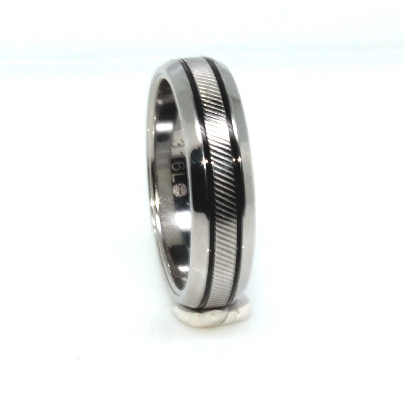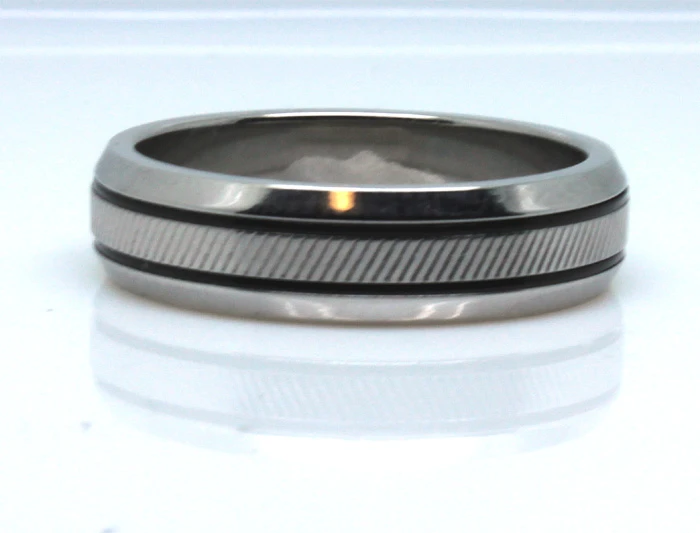 Pánský prsten z chirurgické oceli. Prsten má leštěné okraje, středem prstenu nese jednoduchý vzor ohraničený černými linkami. Prsten je široký 6mm.