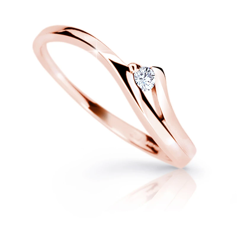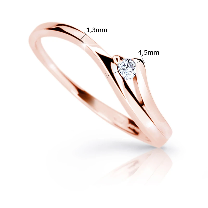 Zlatý zásnubní prsten z růžového zlata 585/1000 osazený kvalitním diamantem. Rozměry prstenu najdete vyobrazené na podpůrném obrázku Briliant zasazený v prstenu má hmotnost 0,060 ct. Kvalita briliantu je hodnocena na základě tvz, 4C tříd: