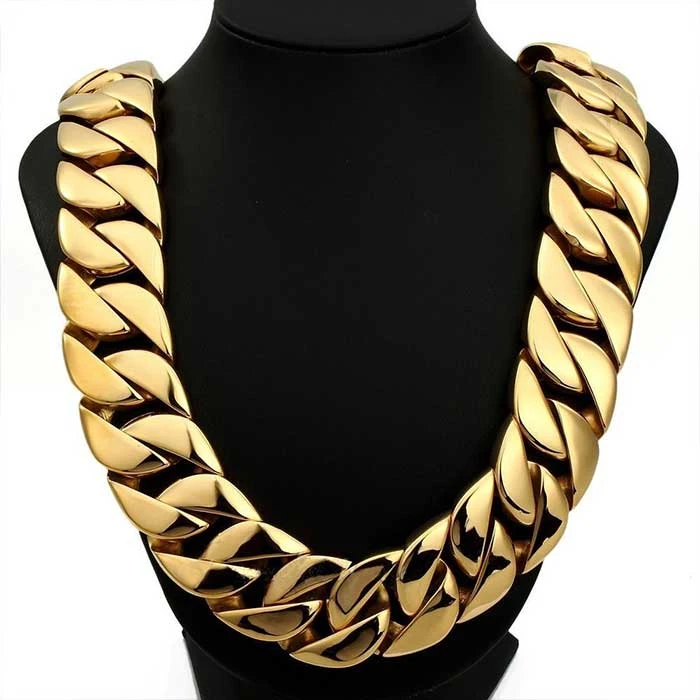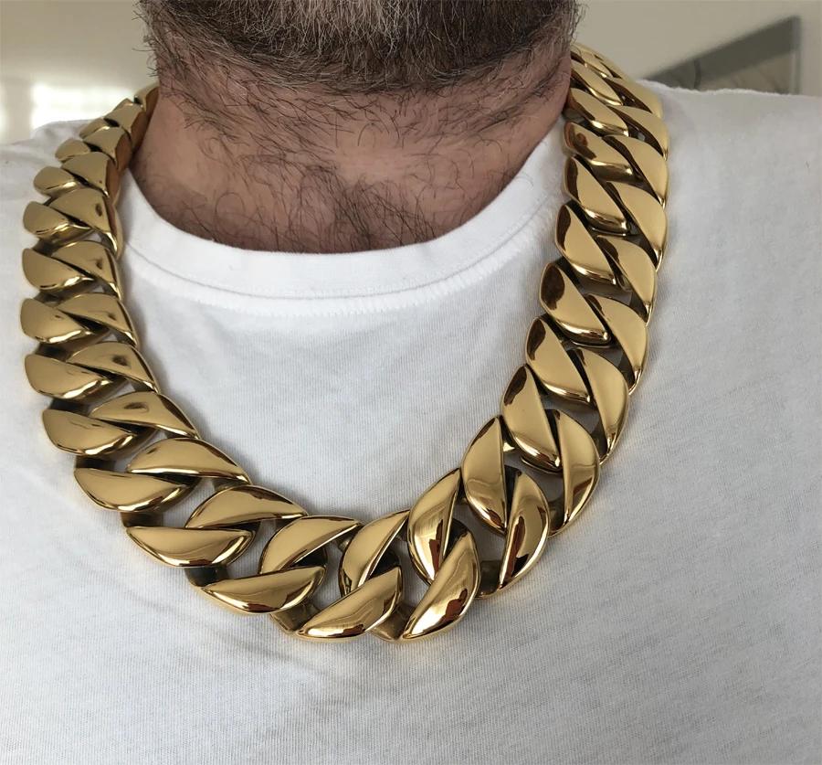Masivní ocelový řetízek s leštěným povrchem pozlaceným technologií IP. Řetěz na krk dlouhý 70cm, šířka 32mm. Zapínání řetízku je na masivní klip. Velmi masivní ocelový řetízek na krk. Hmotnost řetězu 860g.