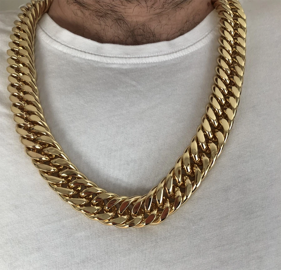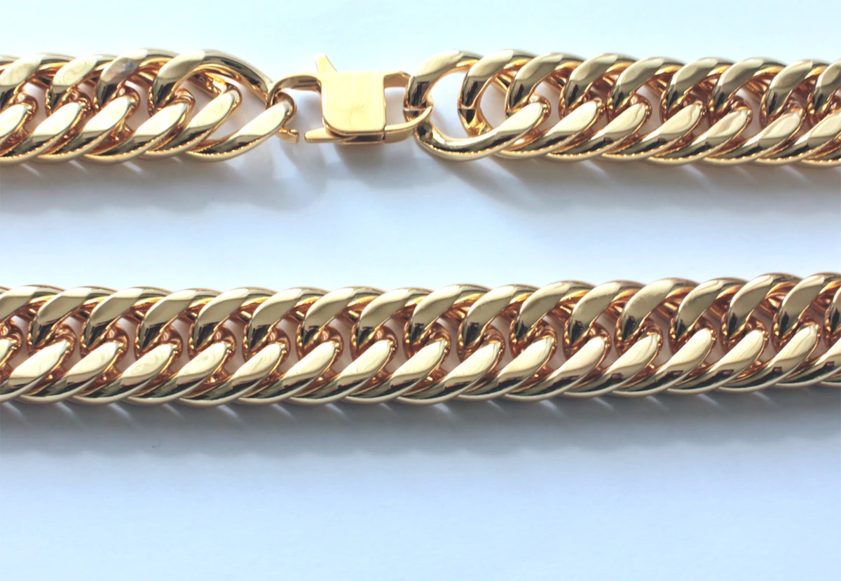 Masivní ocelový řetízek s leštěným povrchem pozlaceným technologií IP. Dvouřadý řetěz na krk široký 22mm. Zapínání řetízku je na karabinu. Velmi masivní ocelový řetízek na krk.