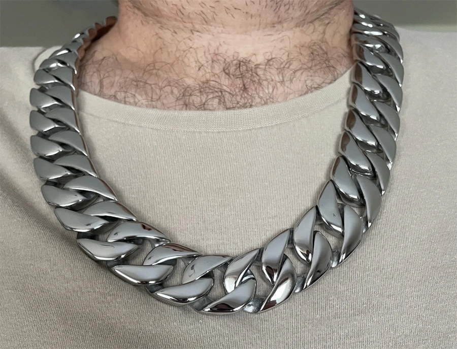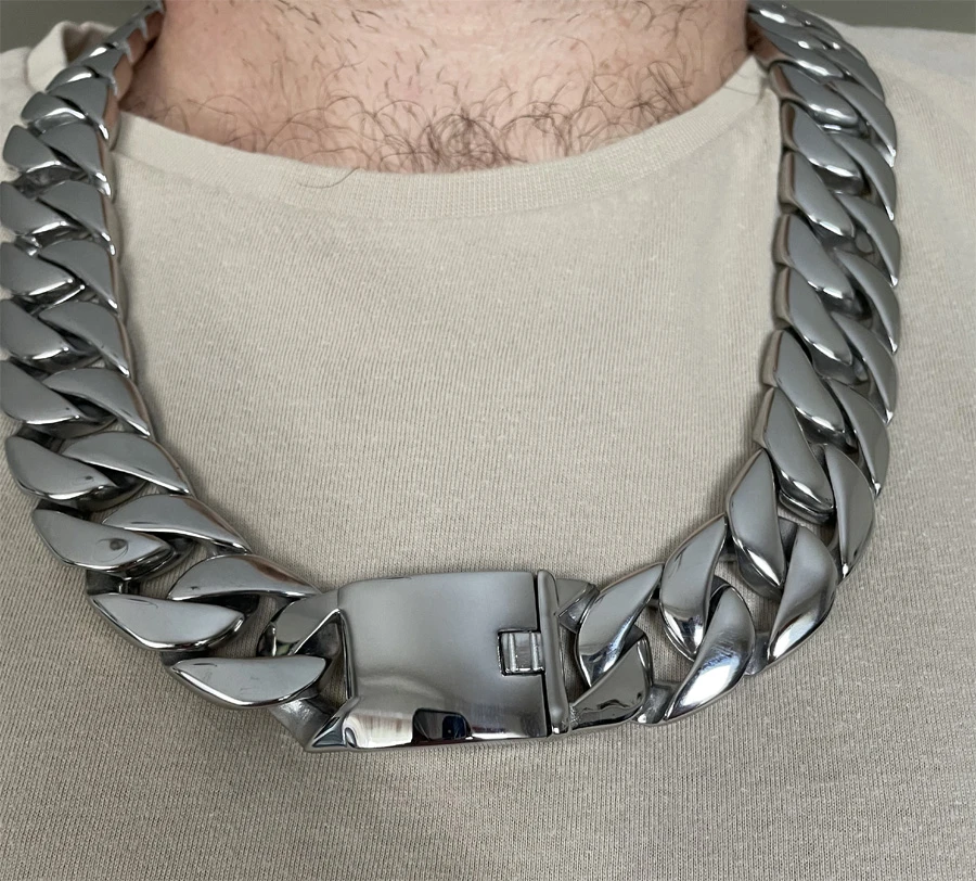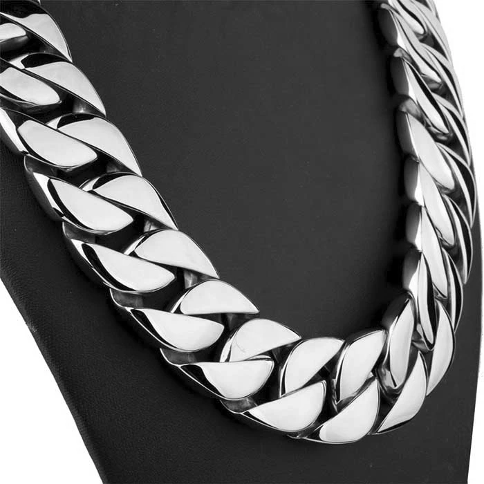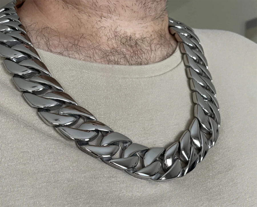 Masivní ocelový řetízek s leštěným povrchem. Řetěz na krk dlouhý 70cm, šířka 25mm. Zapínání řetízku je na masivní klip. Robusní ocelový řetízek na krk. Hmotnost řetězu 550g.