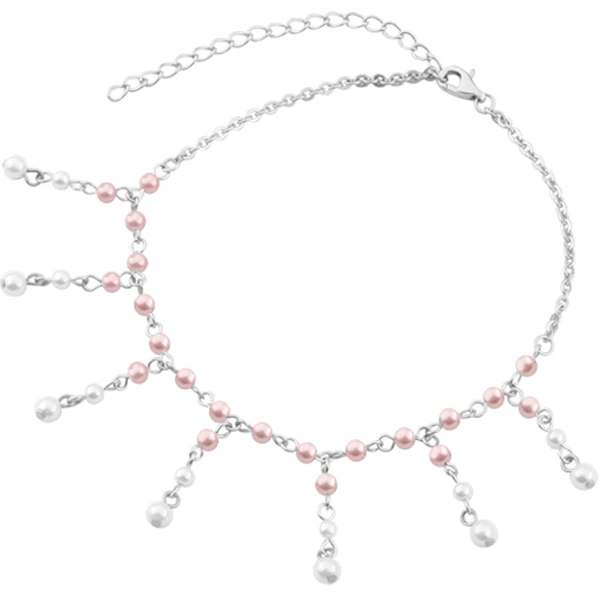 Řetízek na kotník z chirurgické oceli. Řetízek je ozdobený růžovými a bílými korálky. Délku řetízku lze nastavit v rozmezí 23-29cm. Zapínání řetízku je karabinové.