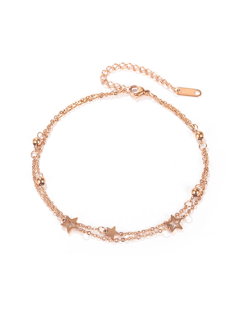 Řetízek na nohu z chirurgické oceli. Řetízek je zdobený hvězdičkami. Obrysy hvězd mají průměr 7mm, plné hvězdičky mají průměr 5mm. Šířka řetízků 1mm. Nastavovací řetízek je široký 2,5mm. Povrch řetízku je leštěný pozlacený technologií PVD. Délku řetízku lze nastavit v rozmezí 22-28cm.