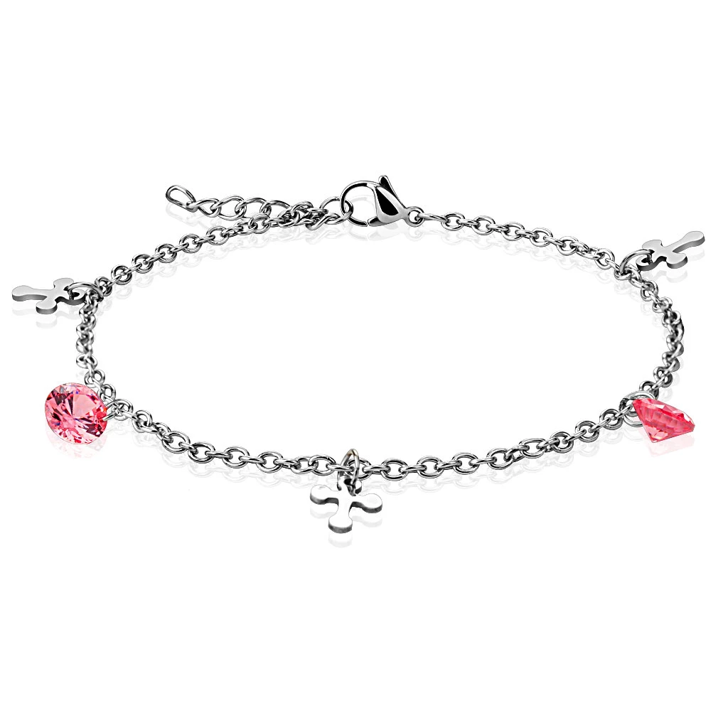 Náramek na kotník z chirurgické oceli s přívěsky a zirkony. Všechny ocelové šperky jsou odolné proti poškození, neoxydují a nevyvolávají alergické reakce.