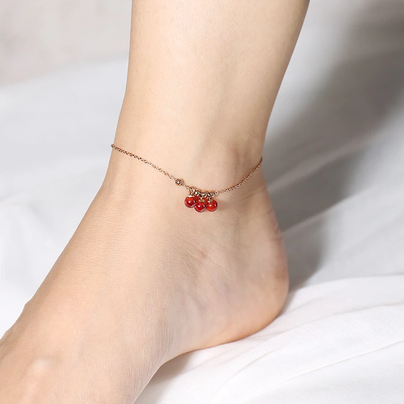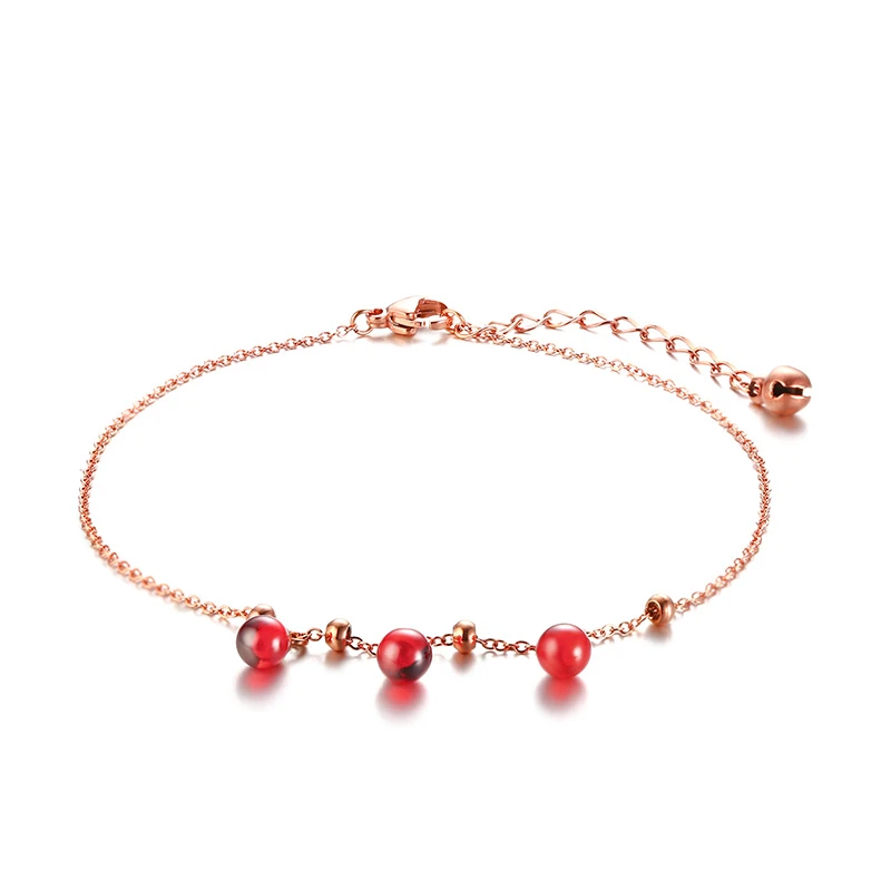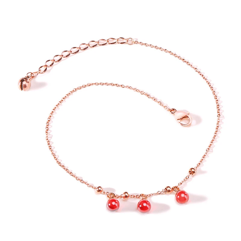 Náramek na kotník z chirurgické oceli a červených korálků. Povrch náramku je upravený IP barvou růžového zlata. Délku řetízku lze plynule nastavit v rozmezí 22-25 cm. Zapínání náramku na kotník je karabinové.