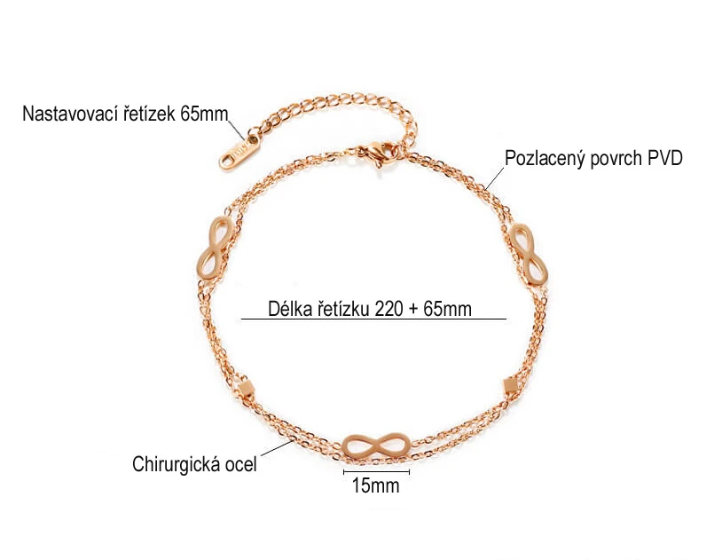 Řetízek na kotník z chirurgické oceli se symboly nekonečna. Povrch náramku je leštěný. Délku řetízku lze plynule nastavit v rozmezí 22-28,5 cm. Zapínání náramku na kotník je karabinové.