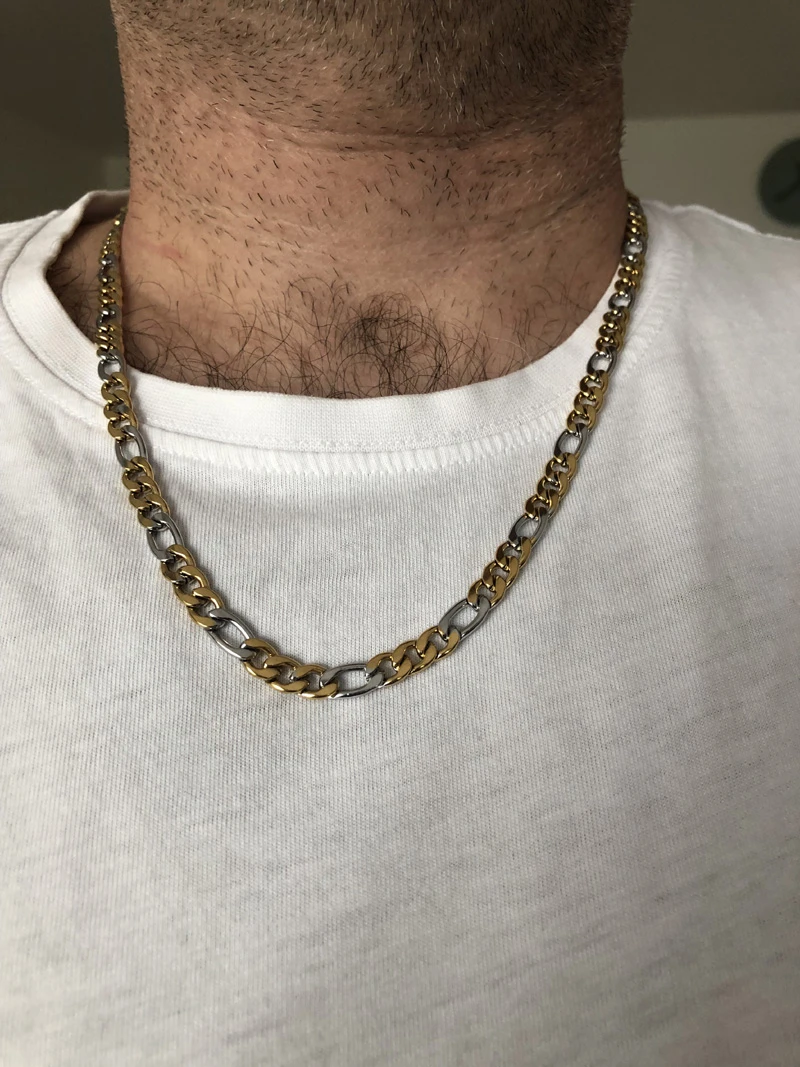 Řetízek na krk z chirurgické oceli. Ocelový řetízek klasického typu Figaro. Povrch řetízku je leštěný částečně pozlacený technologií PVD. Zapínání řetízku je karabinové. Řetízek je široký 6mm. Délka řetízku 71cm. Délku řetízku je možné na přání zdarma zkrátit.
