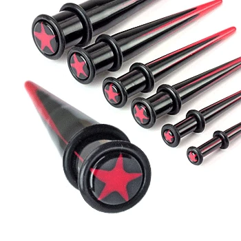 Piercing do ucha. Akrylátový piercing pro roztažení ucha. Piercing kombinuje červenou a černou barvu.