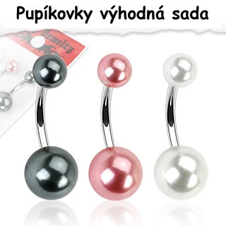 Sada piercingu do pupíku. Sada obsahuje 3ks piercingu pupíku. Každý piercing má dřík z chirurgické oceli 316l. Dřík piercingu má průměr 1,6mm, délka dříku 10mm. Vrchní kulička má průměr 5mm, dolní kulička má průměr 8mm. Povrch kuliček imituje perleť.