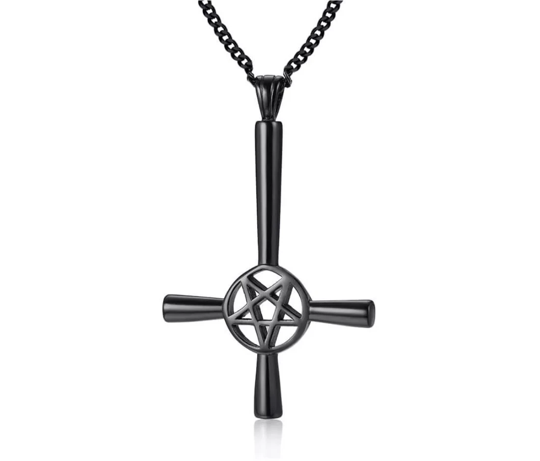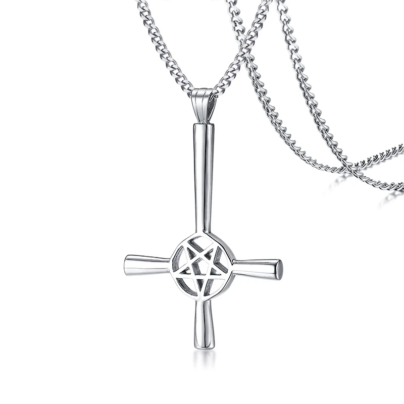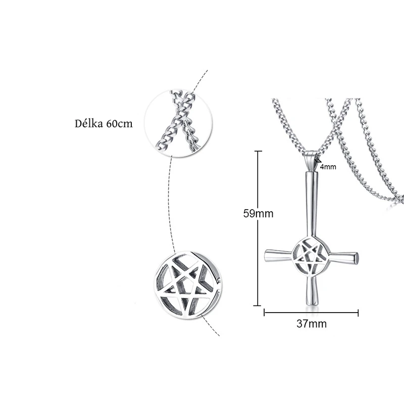 Přívěsek satanský kříž s pentagramem. Povrch kříže je leštěný. Rozměr 59x37 mm. Ke kříži náleží ocelový řetízek dlouhý 60 cm.