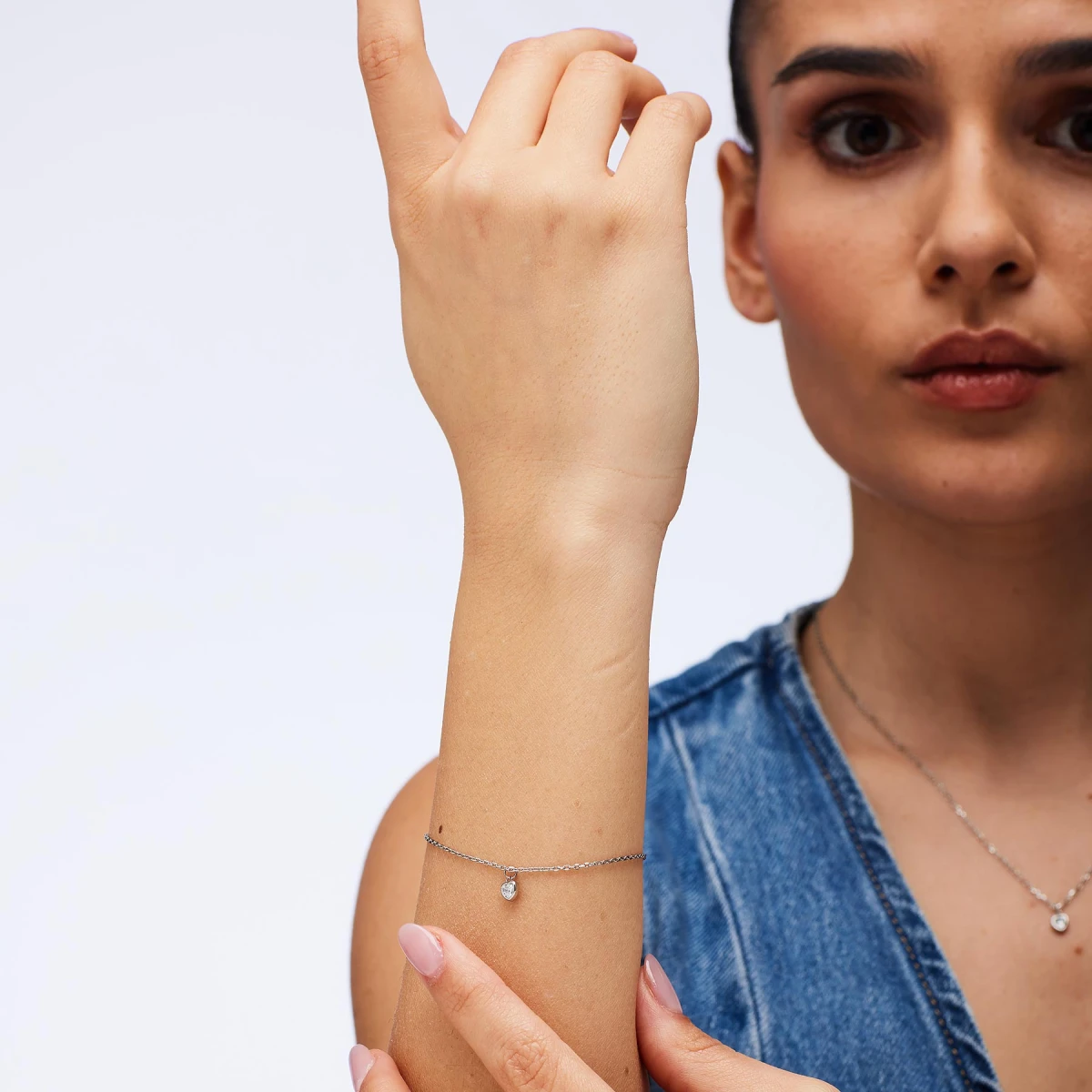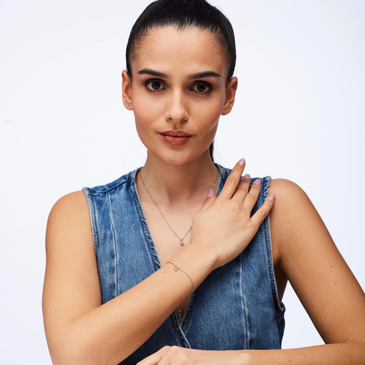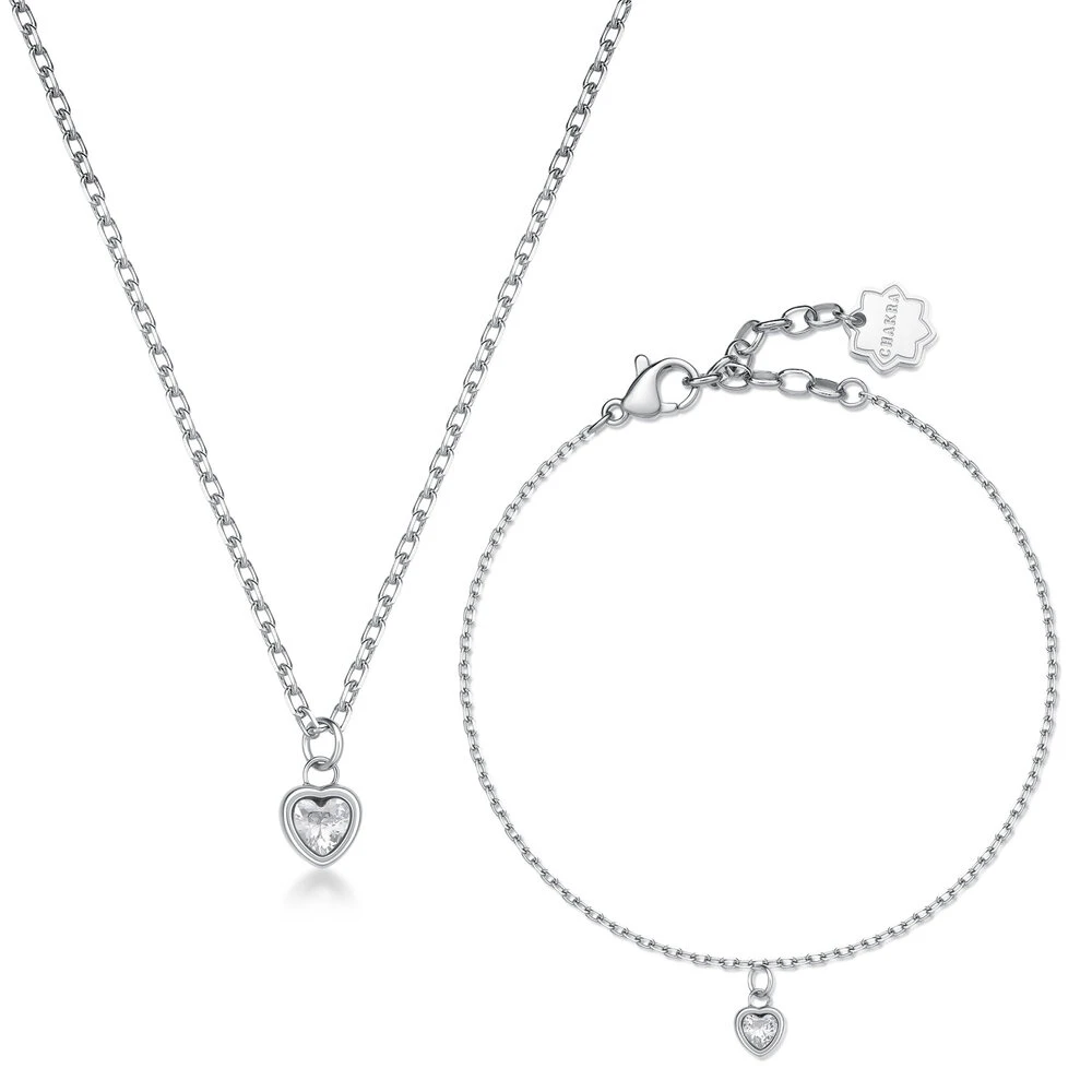Náramek z chirurgické oceli a náhrdelník z chirurgické oceli v sadě. Šperky mají lesklý povrch. Přívěsky ve tvaru srdíčka jsou osazené bílými krystaly. Náramek je dlouhý 19cm. Délka náhrdelníku 50cm.