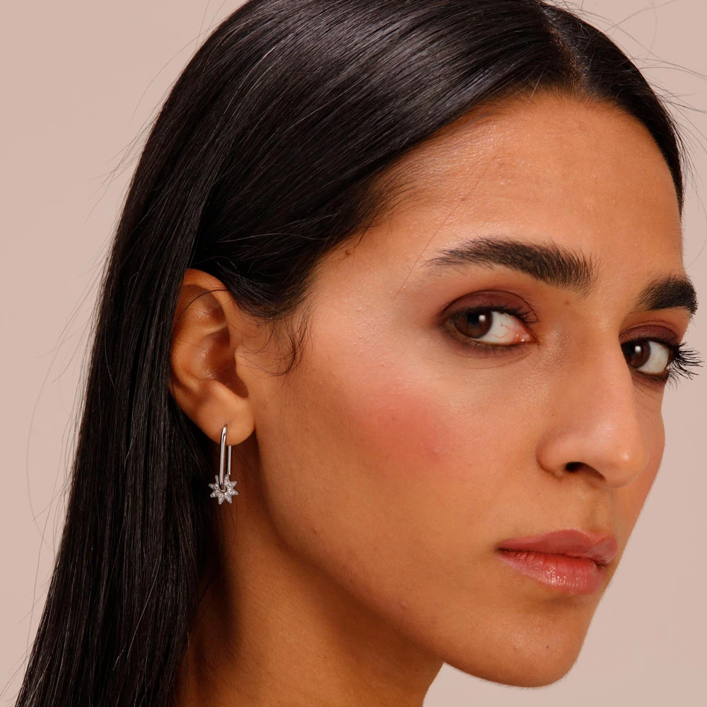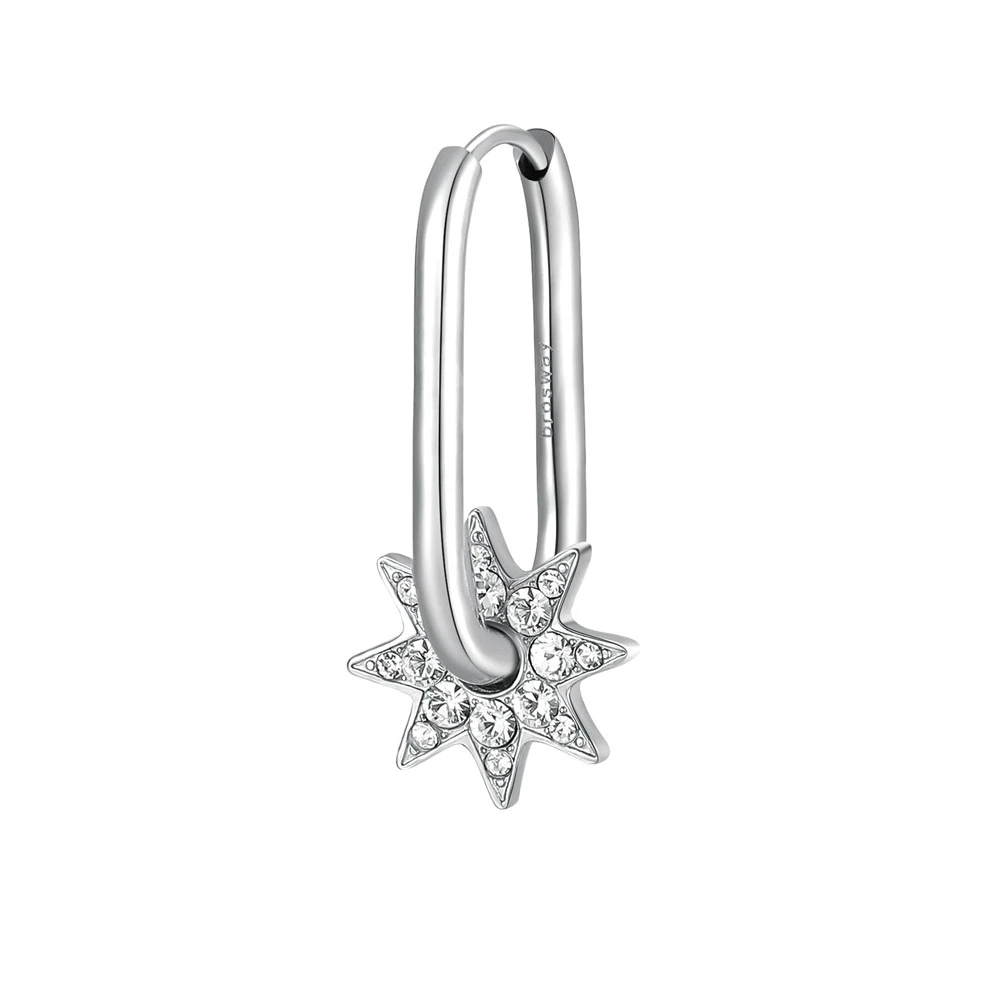 Visací náušnice z chirurgické oceli 316l s hvězdičkou ozdobenou zářivými krystaly. Náušnice má leštěný povrch upravený technologií PVD. Náušnicové zapínání je kloubové. Velikost náušnice je 25 mm. Uvedená cena platí za jednu náušnici, nikoliv za pár.