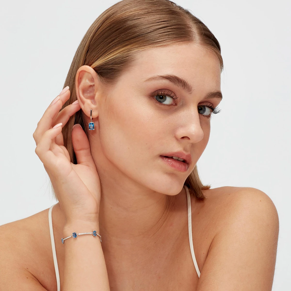 Stříbrná visací náušnice s modrým kamínkem. Náušnice je vyrobená ze stříbra ryzosti 925/1000 a osazená prvotřídním zirkonem. Povrch náušnice je porhodiovaný. Nanesené rhodium dodává náušnici jasnou barvu s leskem a zajišťuje její dlouhodobý bezchybný vzhled. Náušnicové zapínání je kloubové. Uvedená cena platí za jednu náušnici.