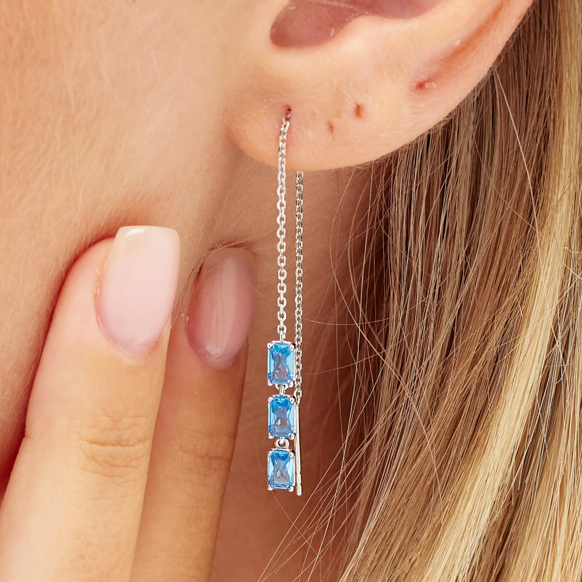 Stříbrná visací náušnice s řetízkem. Náušnice je vyrobená ze stříbra ryzosti 925/1000 a osazená prvotřídními zirkony. Povrch náušnice je porhodiovaný. Nanesené rhodium dodává náušnici jasnou barvu s leskem a zajišťuje její dlouhodobý bezchybný vzhled. Uvedená cena platí za jednu náušnici.
