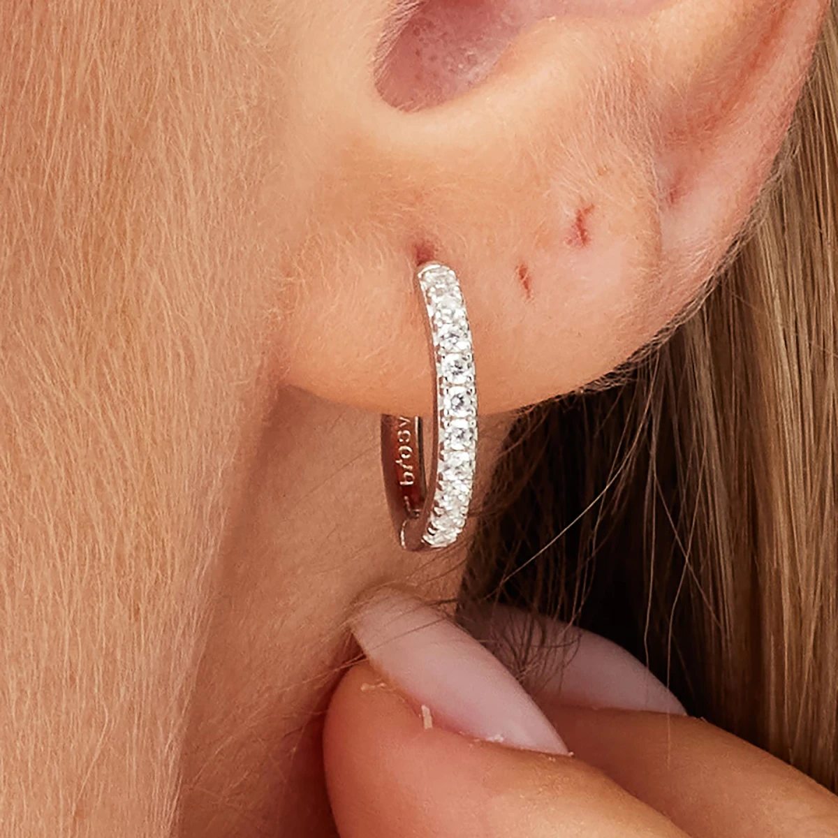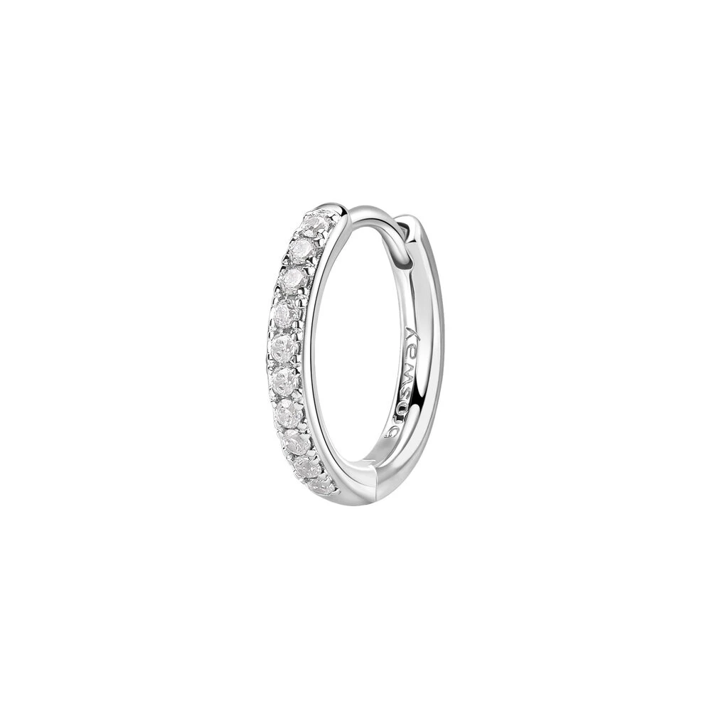 Stříbrná náušnice kroužek. Náušnice je vyrobena ze stříbra 925/1000 a je osazena prvotřídními zirkony. Povrch náušnice je porhodiovaný, nanesené rhodium dodává náušnici jasnou barvu s leskem a zaručuje její dlouhodobý bezchybný vzhled. Zapínání náušnice je kloubové. Průměr náušnice 16mm. Tato náušnice se prodává po 1. kuse.