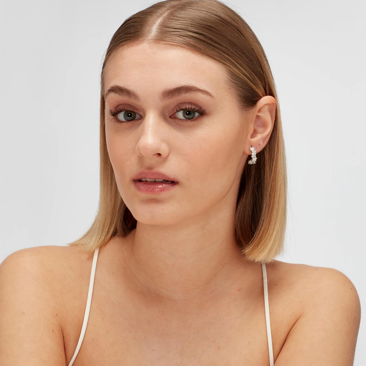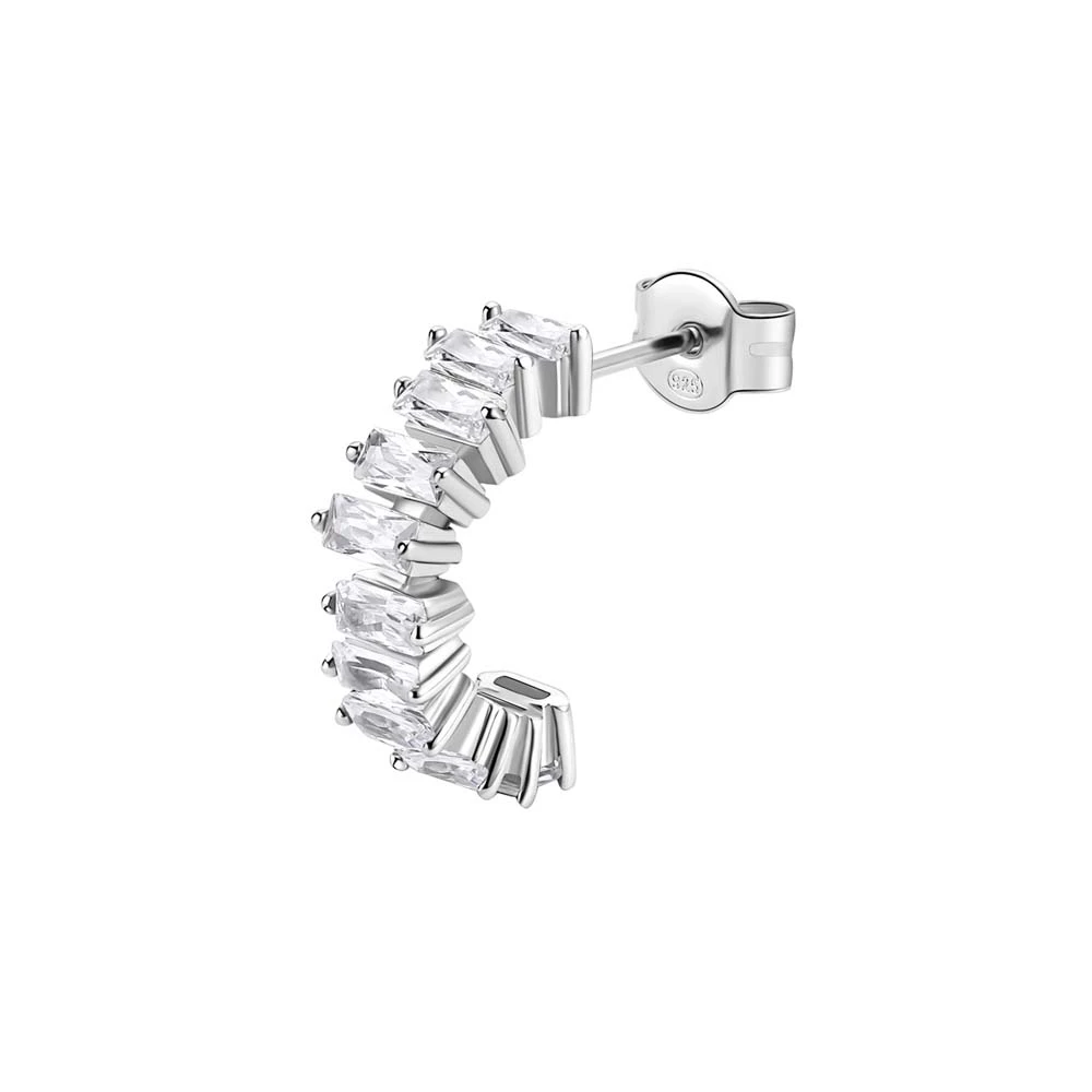 Stříbrná náušnice polokroužek. Náušnice je vyrobená ze stříbra ryzosti 925/1000 a osazená prvotřídními zirkony. Povrch náušnice je porhodiovaný. Nanesené rhodium dodává náušnici jasnou barvu s leskem a zajišťuje její dlouhodobý bezchybný vzhled. Náušnicové zapínání je na puzetku. Uvedená cena platí za jednu náušnici.