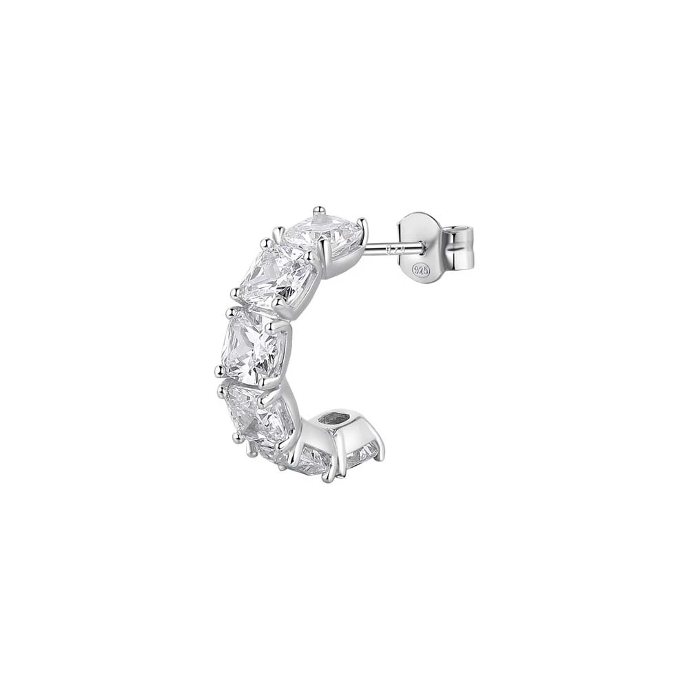 Stříbrná náušnice půlkroužek. Náušnice je vyrobená ze stříbra ryzosti 925/1000 a osazená prvotřídními zirkony. Povrch náušnice je porhodiovaný. Nanesené rhodium dodává náušnici jasnou barvu s leskem a zajišťuje její dlouhodobý bezchybný vzhled. Náušnicové zapínání je na puzetku. Uvedená cena platí za jednu náušnici.