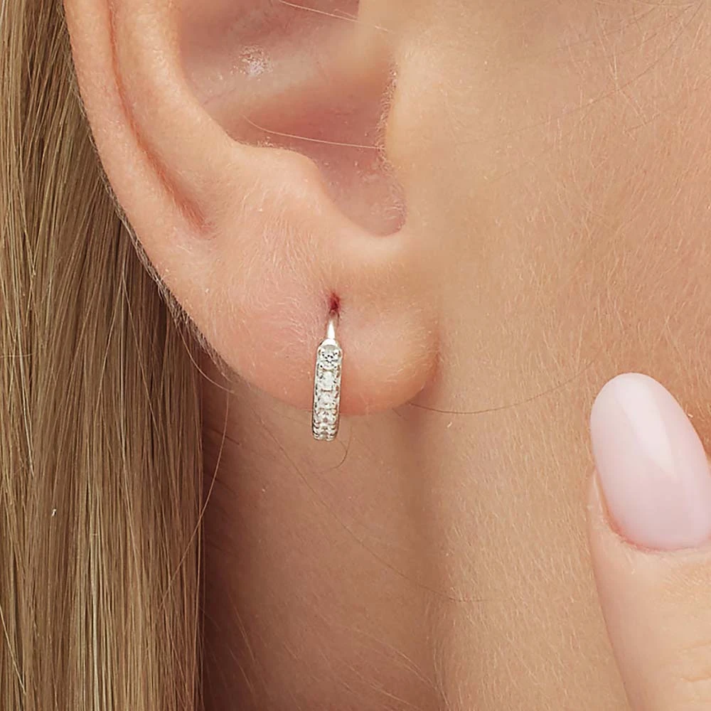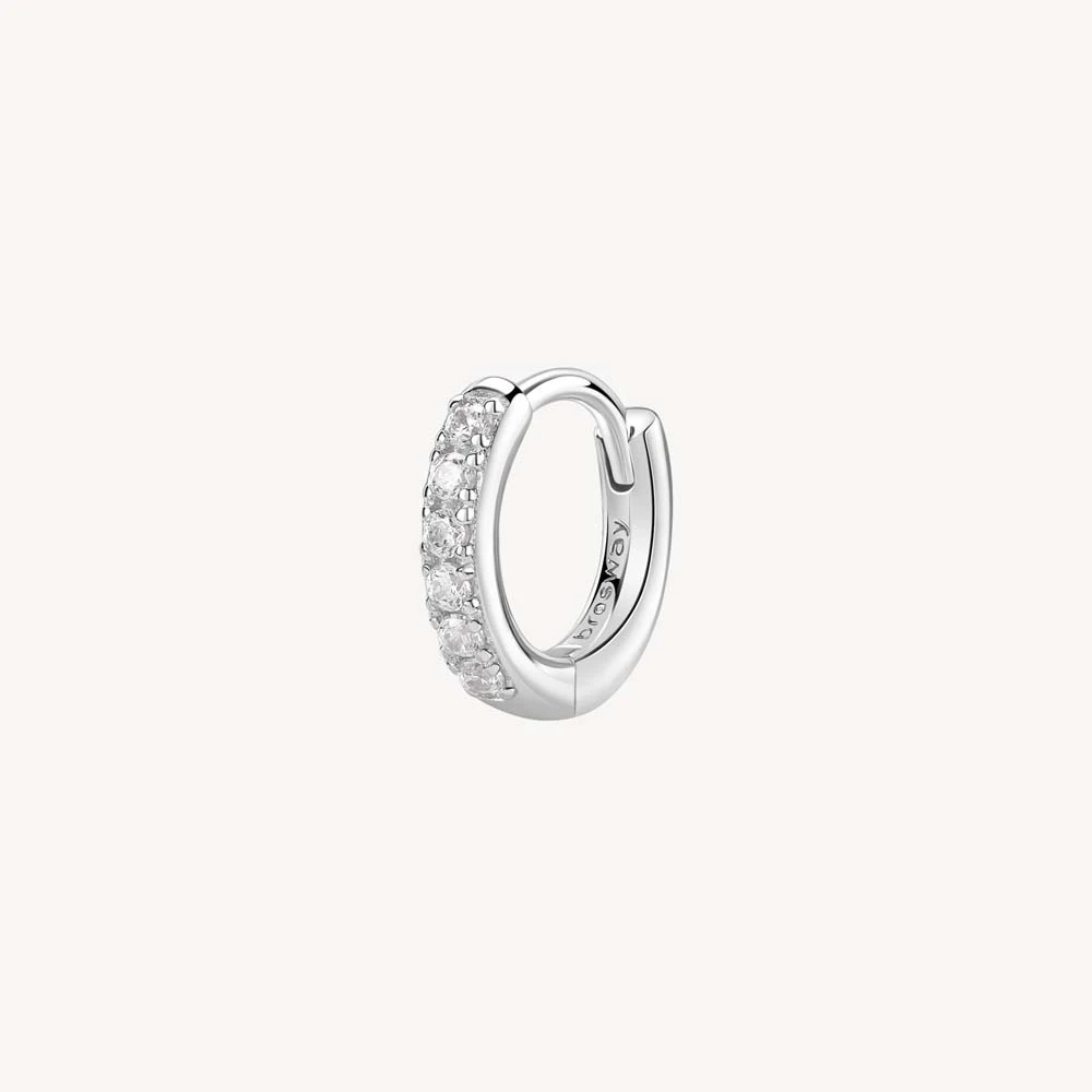 Stříbrná náušnice kroužek se zirkony. Náušnice je vyrobená ze stříbra ryzosti 925/1000 a osazená prvotřídními zirkony. Povrch náušnice je porhodiovaný. Nanesené rhodium dodává náušnici jasnou barvu s leskem a zajišťuje její dlouhodobý bezchybný vzhled. Náušnicové zapínání je kloubové. Uvedená cena platí za jednu náušnici.