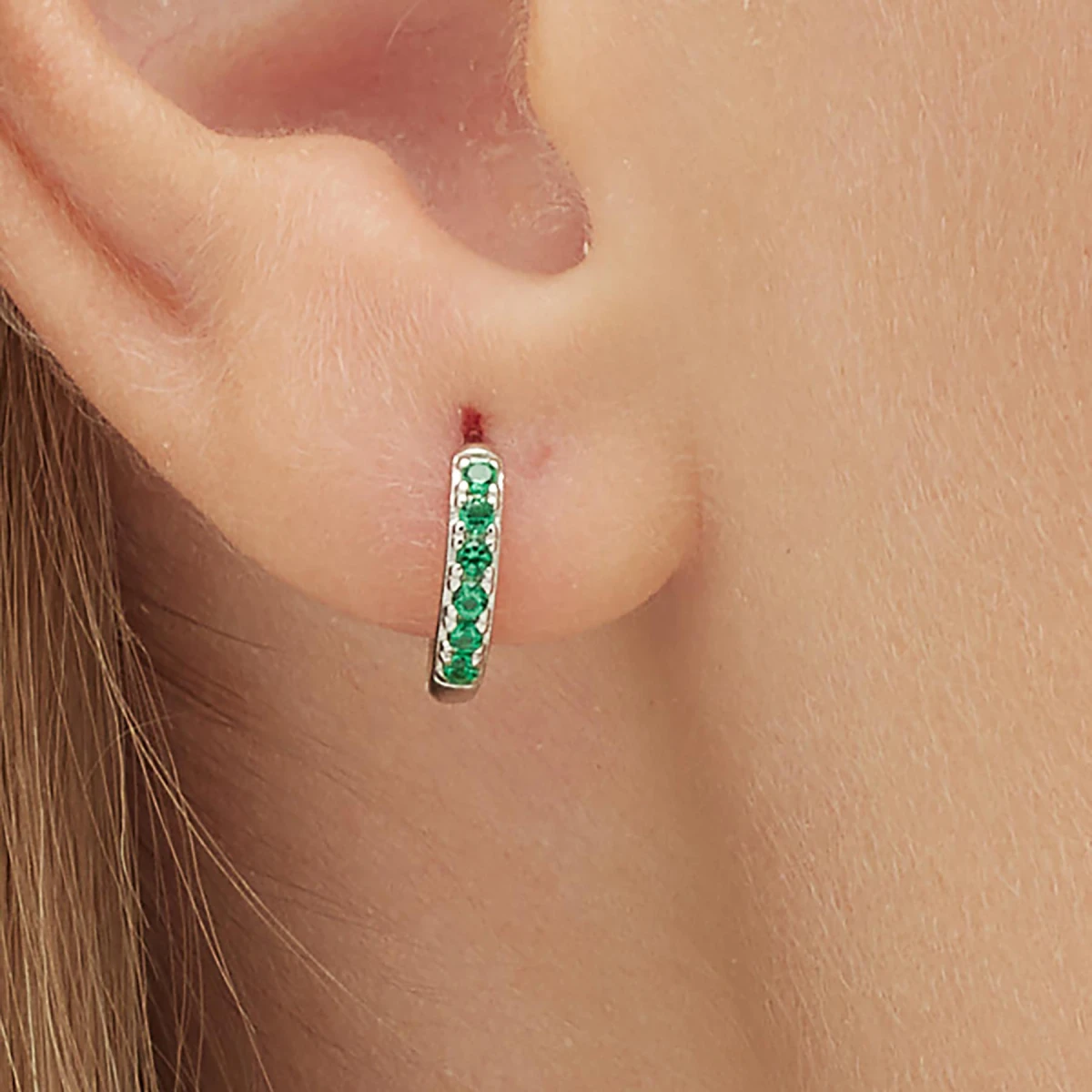 Náušnice se zirkony kroužek. Náušnice je vyrobená ze stříbra ryzosti 925/1000, osazená prvotřídními zirkony. Povrch náušnice je porodiovaný. Nanesené rodium dodává náušnici jasnou barvu s leskem, současně chrání její povrch před poškrábáním a zaručuje náušnici dlouhodobý bezvadný vzhled. Náušnicové zapínání je kloubové. Uvedená cena platí ze jednu náušnici.