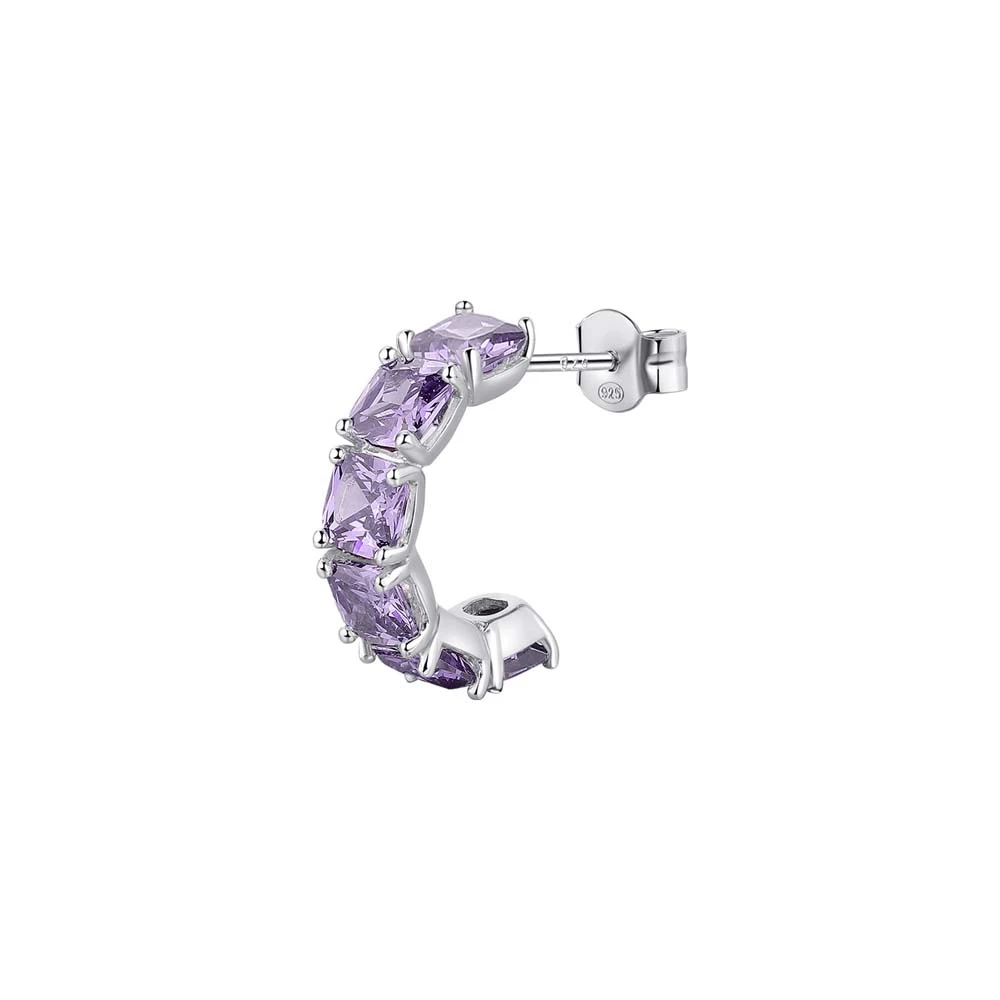 Stříbrná náušnice půlkroužek. Náušnice je vyrobená ze stříbra ryzosti 925/1000 a osazená prvotřídními zirkony. Povrch náušnice je porhodiovaný. Nanesené rhodium dodává náušnici jasnou barvu s leskem a zajišťuje její dlouhodobý bezchybný vzhled. Náušnicové zapínání je na puzetku. Uvedená cena platí za jednu náušnici.