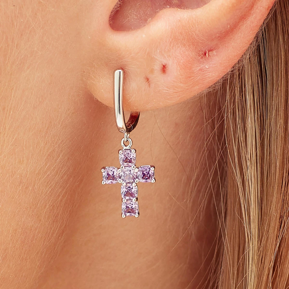 Stříbrná visací náušnice křížek. Náušnice je vyrobena ze stříbra ryzosti 925/1000 a jsou osazena prvotřídními zirkony. Povrch náušnic je porodiovaný. Nanesené rodium dodává náušnici jasnou barvu s leskem, současně chrání jejich povrch před poškrábáním a zaručuje náušnicím dlouhodobý bezvadný vzhled. Náušnicové zapínání je kloubové.