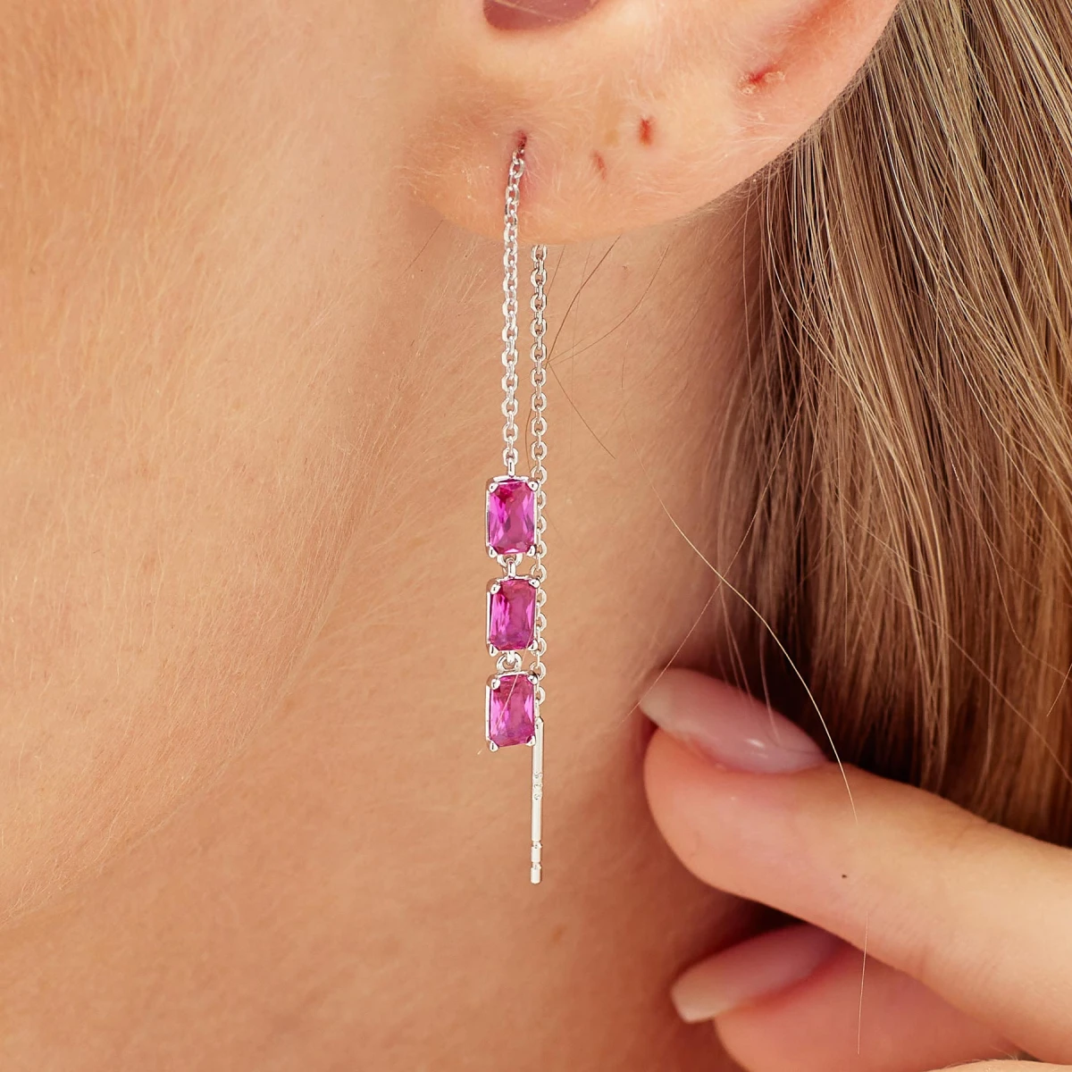 Stříbrná visací náušnice s řetízkem. Náušnice je vyrobená ze stříbra ryzosti 925/1000 a osazená prvotřídními zirkony. Povrch náušnice je porhodiovaný. Nanesené rhodium dodává náušnici jasnou barvu s leskem a zajišťuje její dlouhodobý bezchybný vzhled. Uvedená cena platí za jednu náušnici.