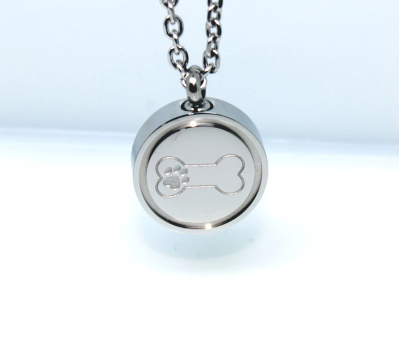 Smuteční přívěsek z chirurgické oceli. V přívěsku je možné uchovat popel, či srst zesnulého pejska. Průměr přívěsku 19mm, výška i se závěsným očkem 25mm. K přívěsku náleží řetízek z chirurgické oceli vzor ankr dlouhý 60cm. Délku řetízku lze na přání zdarma zkrátit.