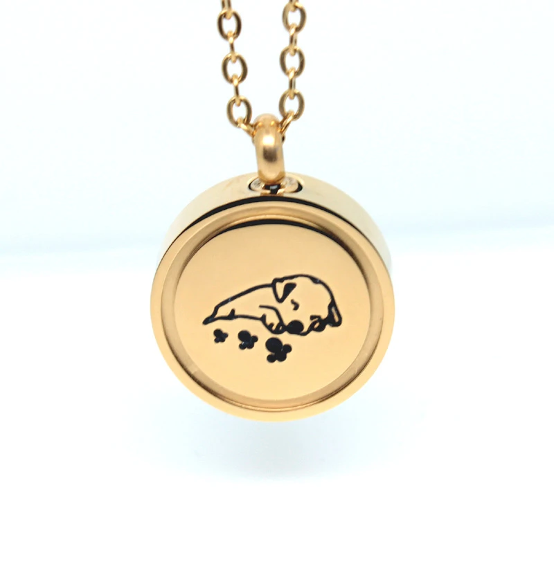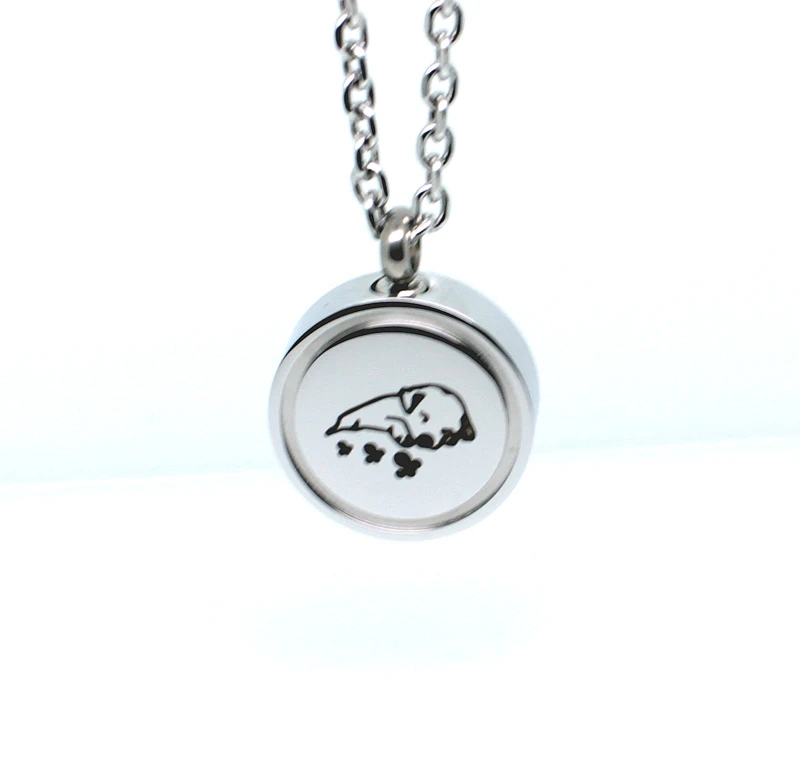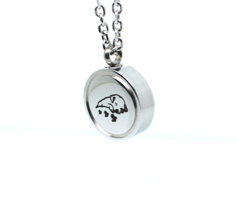 Smuteční přívěsek z chirurgické oceli. V přívěsku je možné uchovat popel, či srst zesnulého pejska. Průměr přívěsku 19mm, výška i se závěsným očkem 25mm. K přívěsku náleží řetízek z chirurgické oceli vzor ankr dlouhý 60cm. Délku řetízku lze na přání zdarma zkrátit.