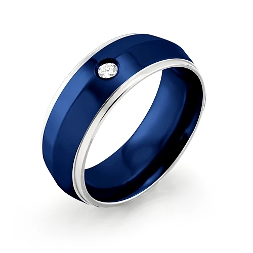 Prsten vyrobený z chirurgické oceli 316L. Prsten má leštěný povrch. Prsten je kombinace leštěné oceli a modré barvy. Prsten je osazený zirkonem. Prsten je široký 8mm.