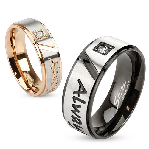 Prsten vyrobený z chirurgické oceli 316l. Povrch dámských prstenů je zlatá IP barva, povrch pánských prstenů je černá IP barva. Dámské velikosti 50–57 jsou široké 6mm, pánské velikosti 59–70 jsou široké 8mm. Hezký snubní ocelový prsten.