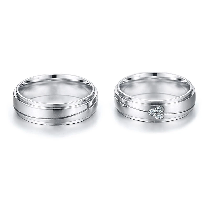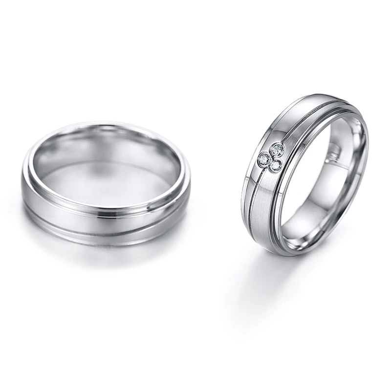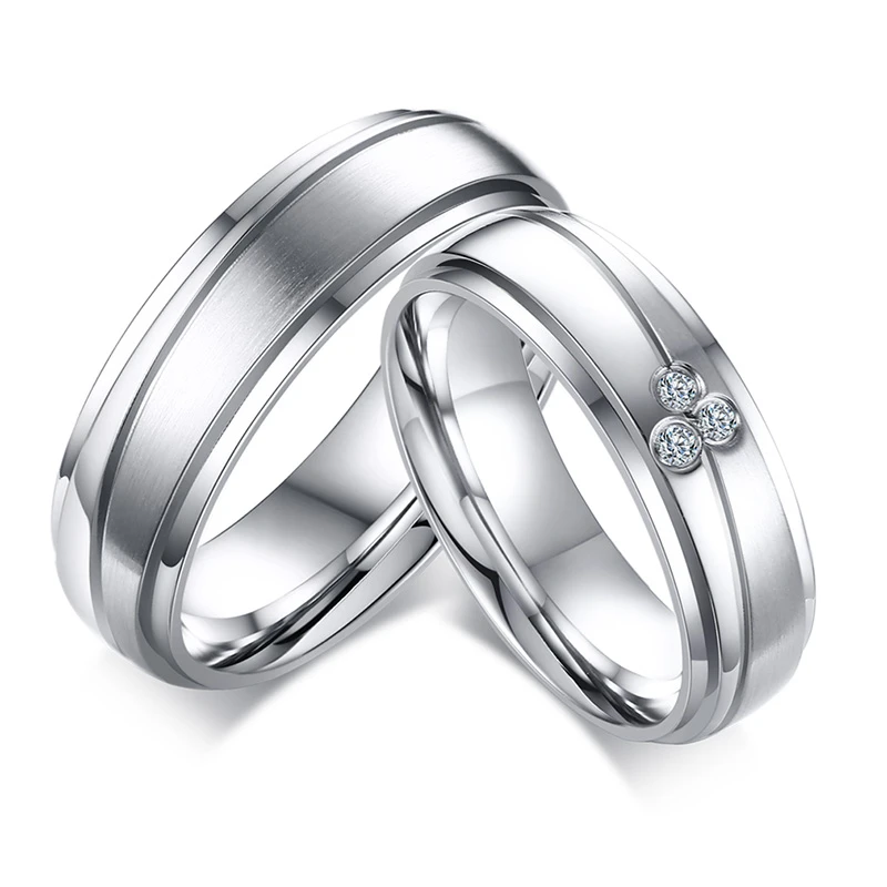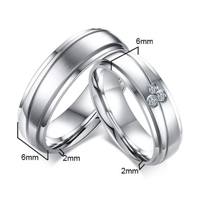 Snubní prstýnky z chirurgické oceli. Povrch prstenů je kombinace mat/lesk. Dámské snubní prstýnky ve velikostech 49-57 jsou ozdobené zirkony. U tohoto vzoru je možné objednat velikost 54 a 57 bez kamínků, pánské snubní prsteny ve velikostech 59-67 jsou bez kamínků. Pánské i dámské prstýnky jsou široké 6mm. Uvedená cena platí za jeden snubní prsten. Cena za snubní prstýnek s kamínky je jiná než za snubní prsten bez kamínků.