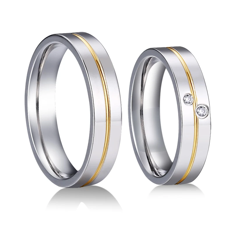 Ocelové snubní prsteny s leštěným povrchem. Pánský i dámský prstýnek má po celém obvodě ve svém středu zlatou linkou. Prsteny jsou široké 6 mm. Snubní prstýnky ve velikostech 49-59 mohou být osazeny zirkony. Snubní prsteny ve velikostech 62-67 jsou bez kamínků. Uvedená cena platí za jeden snubní prsten. Za snubní prsten se zirkony platí jiná cena, než za snubní prstýnek bez zirkonů.