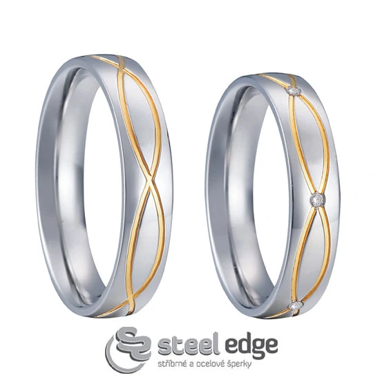 Snubní prsteny z chirurgické oceli. Povrch prstenů je kombinace zlacené a leštěné oceli. Dámské prstýnky ve velikostech 49-57 jsou osazené fasovanými zirkony. Pánské prsteny ve velikostech 59-70 jsou bez zirkonů. Snubní prsteny široké 6 mm. Výše uvedená cena je za jeden snubní prsten. Dámský snubní prsten se zirkony je za jinou cenu nežli pánský snubní prsten bez zirkonů.