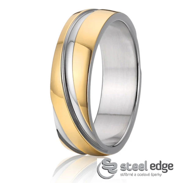Snubní prsteny z chirurgické oceli. Povrch prstenů je pozlacený s plastickou drážkou po celém obvodě prstenu. Snubní prsteny široké 6 mm. Výše uvedená cena je za jeden snubní prsten.