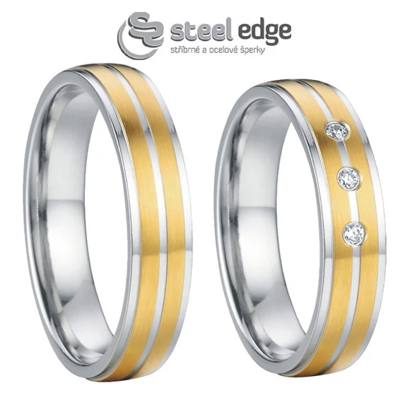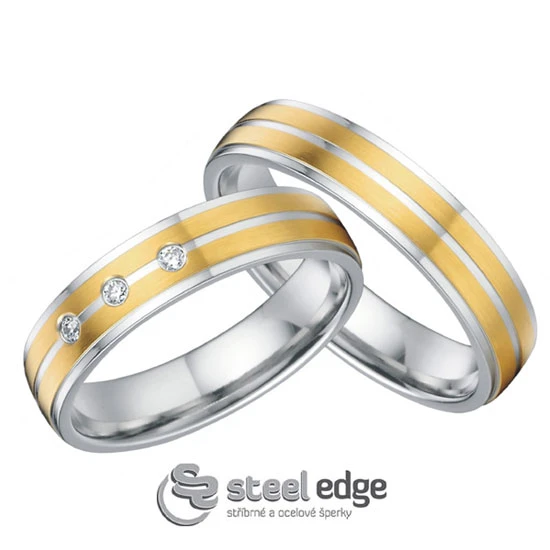 Snubní prsteny z chirurgické oceli. Pozlacené proužky jsou matné stříbrné drážky jsou leštěné. Dámské prstýnky ve velikostech 49-57 jsou osazené zirkony. Pánské prsteny ve velikostech 59-70 jsou bez zirkonu. Svatební prsteny široké 6 mm. Výše uvedená cena je za jeden snubní prsten. Dámský snubní prsten se zirkony je za jinou cenu nežli pánský snubní prsten bez zirkonů.