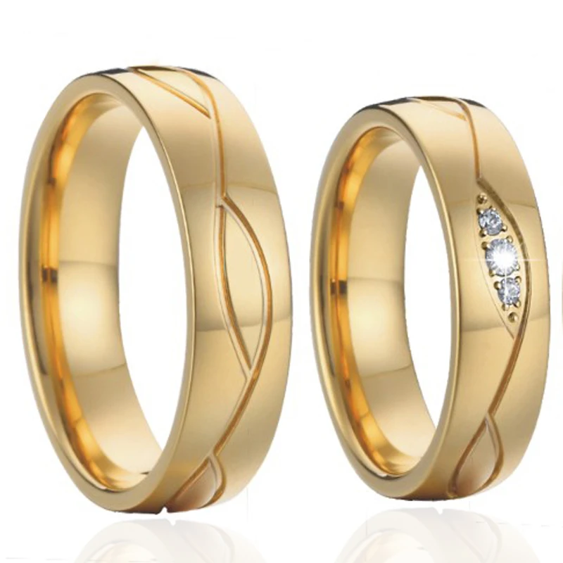 Snubní prsteny z chirurgické oceli. Pozlacený povrch prstenů je leštěný se vzorem. Dámské prstýnky ve velikostech 49-57 jsou osazené fasovanými zirkony. Pánské prsteny ve velikostech 59-70 jsou bez zirkonů. Prstýnky jsou široké 5mm. Výše uvedená cena je za jeden snubní prsten. Dámský snubní prsten se zirkony je za jinou cenu nežli pánský snubní prsten bez zirkonů.