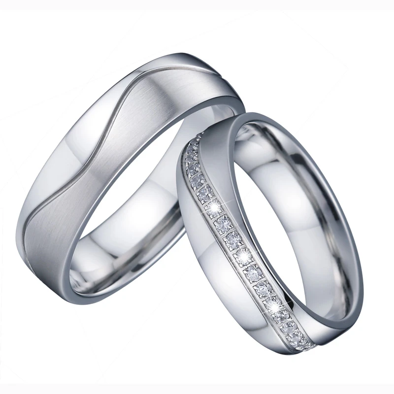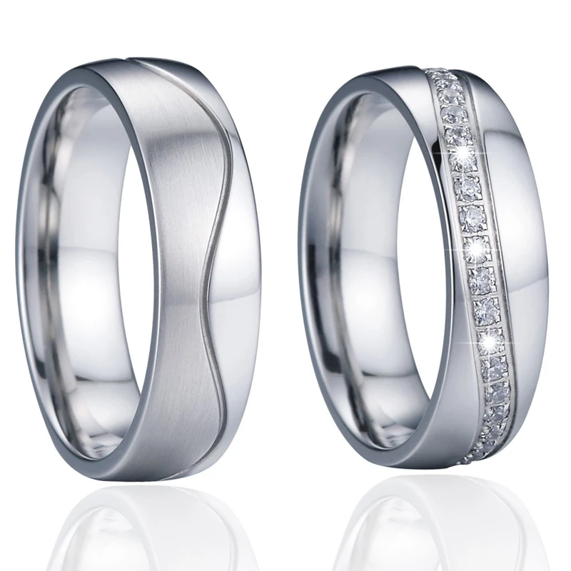 Snubní prsteny z chirurgické oceli. Povrch prstenů je leštěný. Dámské prstýnky ve velikostech 49-57 jsou osazené fasovanými zirkony. Pánské prsteny ve velikostech 59-70 jsou bez zirkonů. Prstýnky jsou široké 6mm. Výše uvedená cena je za jeden snubní prsten. Dámský snubní prsten se zirkony je za jinou cenu nežli pánský snubní prsten bez zirkonů.