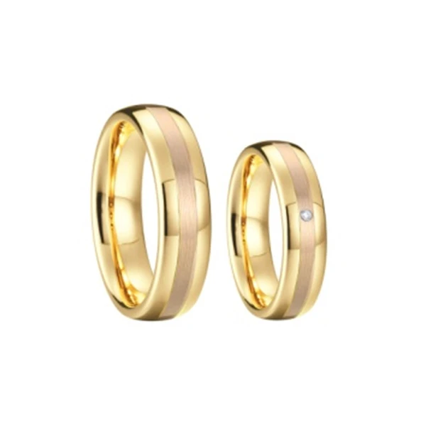 Snubní prsteny z chirurgické oceli. Povrch prstenů je pozlacený technologií PVD. Dámské prstýnky ve velikostech 49-57 jsou osazené zirkonem, široké 4mm. Pánské prsteny ve velikostech 59-70 jsou bez zirkonu, široké 6mm. Uvedená cena je za jeden snubní prsten. Dámský snubní prsten se zirkonem je za jinou cenu nežli pánský snubní prsten bez zirkonu.