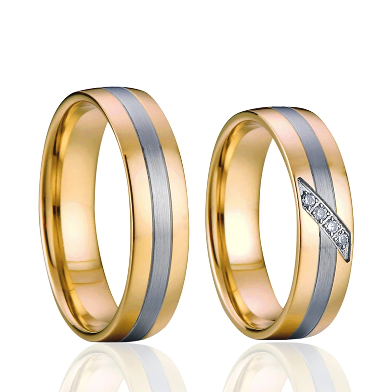 Snubní prsteny z chirurgické oceli. Povrch prstenů je kombinace lesk-mat. Z vnější strany mají prstýnky po stranách leštěné pozlacené proužky s matným stříbrným středem, z vnitřní strany jsou leštěné. Zlacení je provedeno technologií PVD. Dámské prstýnky ve velikostech 49-57 jsou osazené fasovanými zirkony. Pánské prsteny ve velikostech 59-70 jsou bez zirkonů. Prstýnky jsou široké 6mm. Uvedená cena je za jeden snubní prsten. Dámský snubní prsten se zirkony je za jinou cenu nežli pánský snubní prsten bez zirkonů.