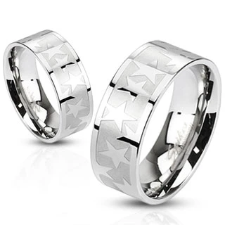 Prsten z chirurgické oceli 316L. Povrch prstenu je kombinace mat/lesk se vzorem hvězd. Prsteny ve velikostech 49–57 jsou široké 6mm, prsteny ve velikostech 59–72 jsou široké 8mm. Prsteny je možné použít jako snubní.