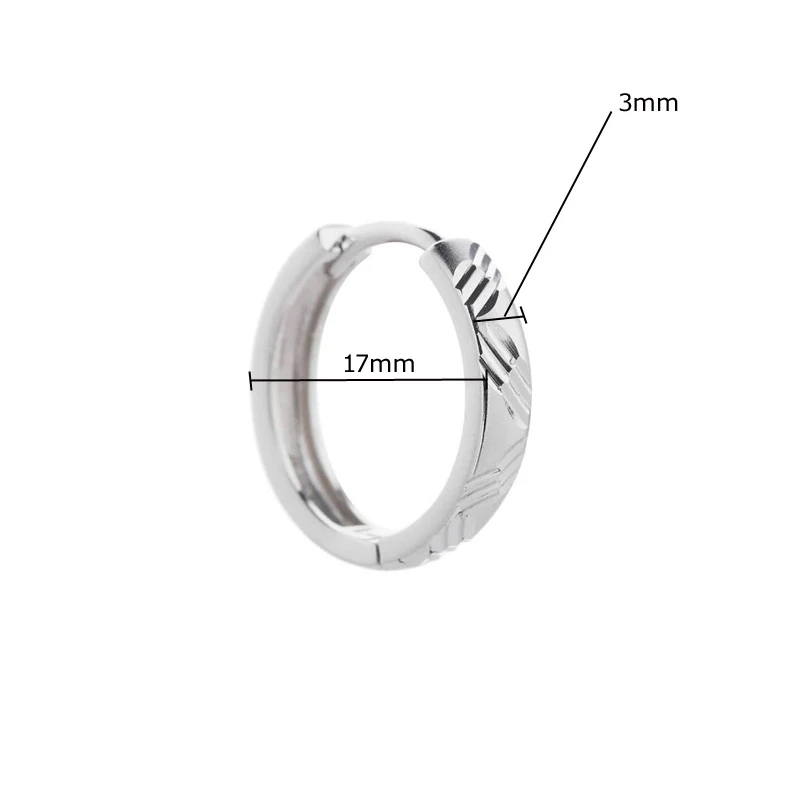Náušnice kruhy vyrobené z kvalitního stříbra 925/1000. Povrch náušnic je kombinace mat/lesk. Náušnice jsou navíc porhodiované , což jim dodává jasnou barvu s leskem, potlačuje přirozenou oxidaci stříbra, zvyšuje odolnost povrchu proti poškrábání a zaručuje dlouhodobý bezvadný vzhled náušnic. Náušnice jsou široké 3 mm, vnější průměr náušnic 17 mm. Náušnicové zapínání je kloubové.