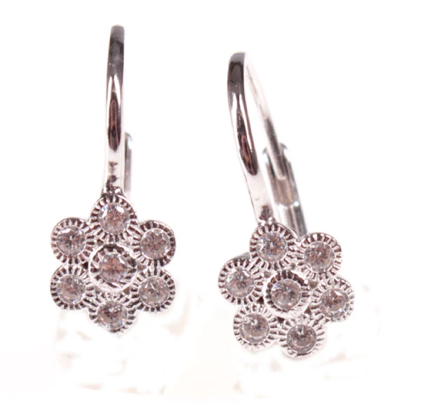 Stříbrné náušnice s kamínky, ve tvaru kytiček. Průměr kytiček 8mm. Rozměr náušnic 17×11mm. Zapínání na stříbrnou klapku.