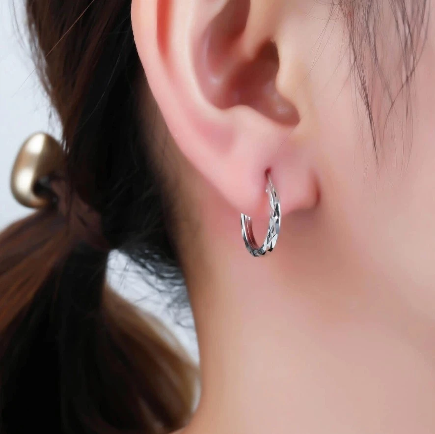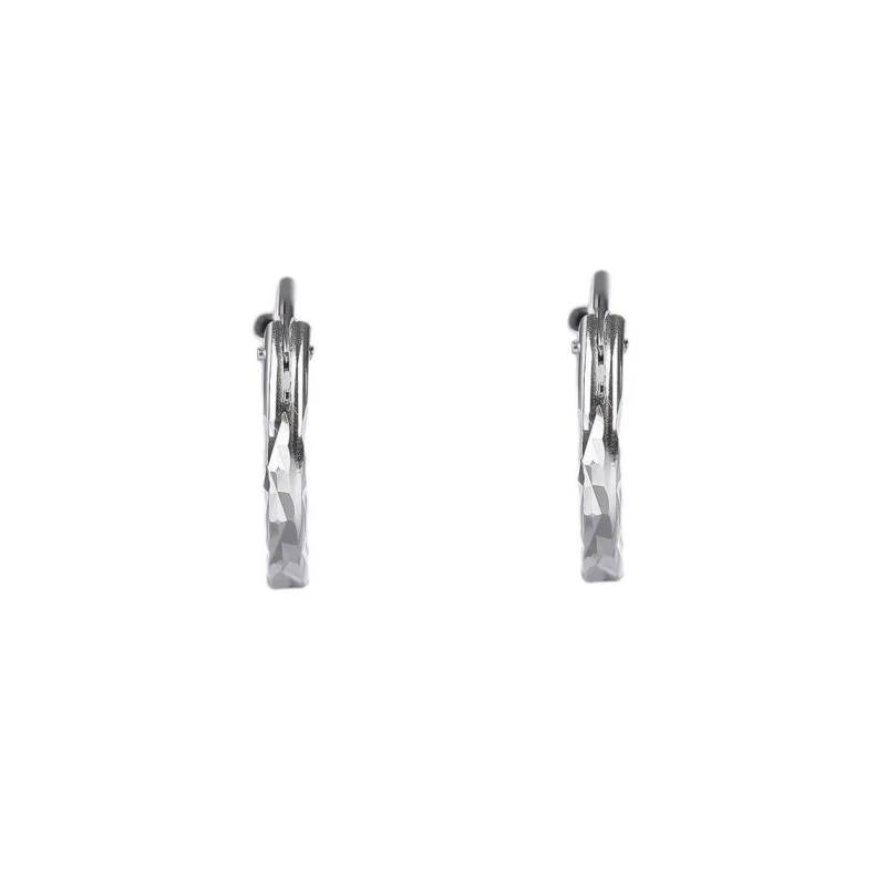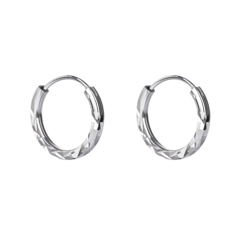 Náušnice kroužky se vzorem vyrobené ze stříbra 925/1000. Povrch náušnic je porhodiovaný. Úprava náušnic rhodiováním jim dodává jasnou barvu s leskem, zvyšuje odolnost povrchu proti poškrábání a zaručuje náušnicím dlouhodobý bezchybný vzhled. Náušnice jsou široké 2mm, vnější průměr 15mm.