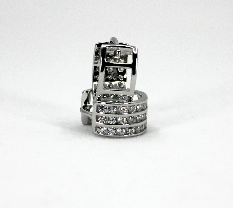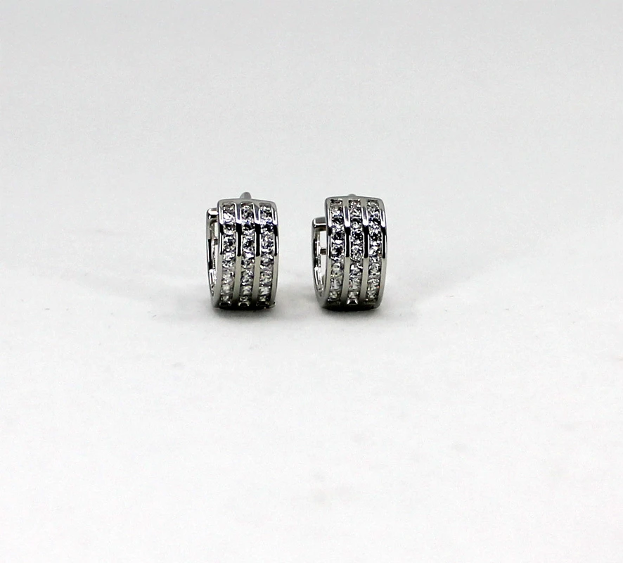 Náušnice kroužky vyrobené z kvalitního stříbra 925/1000. Náušnice jsou osazené prvotřídními zirkony. Povrch náušnic je porhodiovaný, což jim dodává jasnou barvu s leskem, potlačuje přirozenou oxidaci stříbra, zvyšuje odolnost povrchu proti poškrábání a zaručuje dlouhodobý bezvadný vzhled náušnic. Náušnice jsou široké 6mm, vnější průměr náušnic 12mm. Náušnicové zapínání je kloubové.