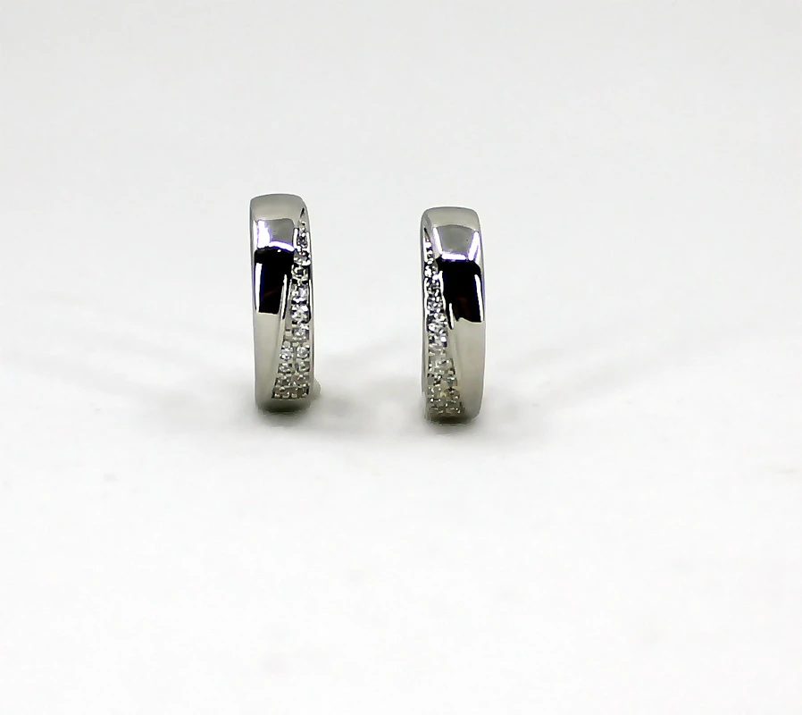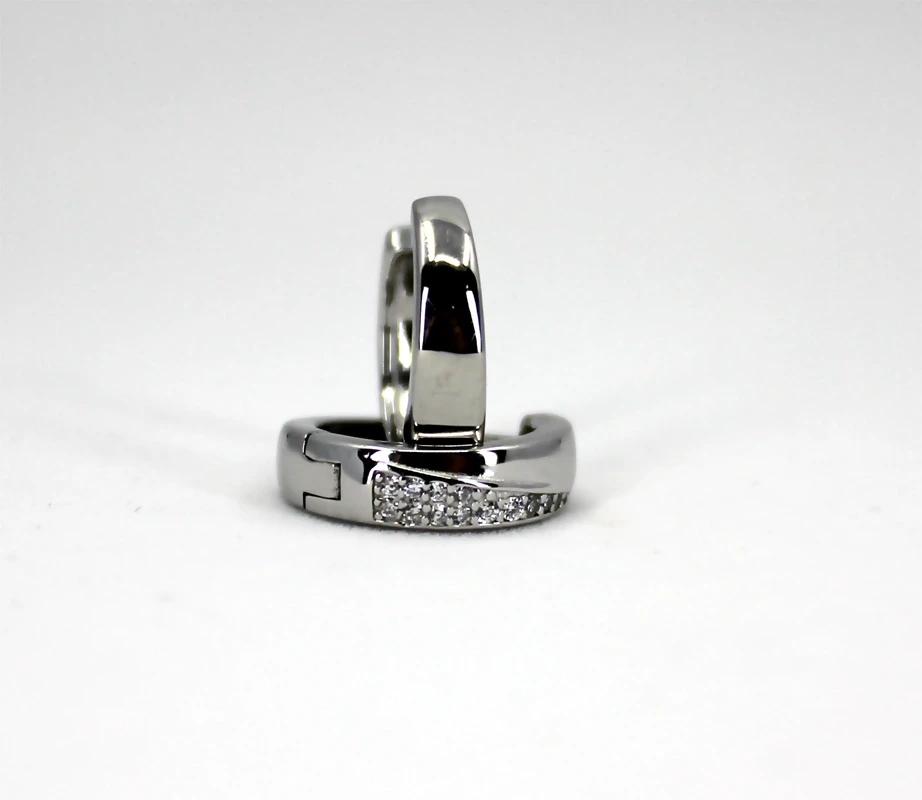Náušnice kroužky vyrobené z kvalitního stříbra 925/1000. Náušnice jsou osazené prvotřídními zirkony. Povrch náušnic je porhodiovaný, což jim dodává jasnou barvu s leskem, potlačuje přirozenou oxidaci stříbra, zvyšuje odolnost povrchu proti poškrábání a zaručuje dlouhodobý bezvadný vzhled náušnic. Náušnice jsou široké 4mm, vnější průměr náušnic 15mm. Náušnicové zapínání je kloubové.