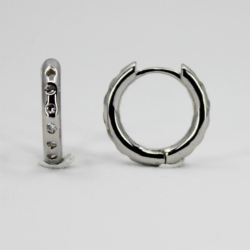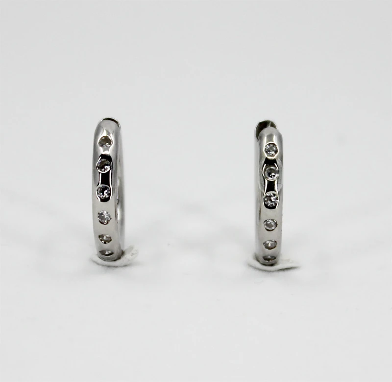 Náušnice kroužky vyrobené z kvalitního stříbra 925/1000. Náušnice jsou osazené prvotřídními zirkony. Povrch náušnic je porhodiovaný, což jim dodává jasnou barvu s leskem, potlačuje přirozenou oxidaci stříbra, zvyšuje odolnost povrchu proti poškrábání a zaručuje dlouhodobý bezvadný vzhled náušnic. Náušnice jsou široké 3mm, vnější průměr náušnic 18mm. Náušnicové zapínání je kloubové.