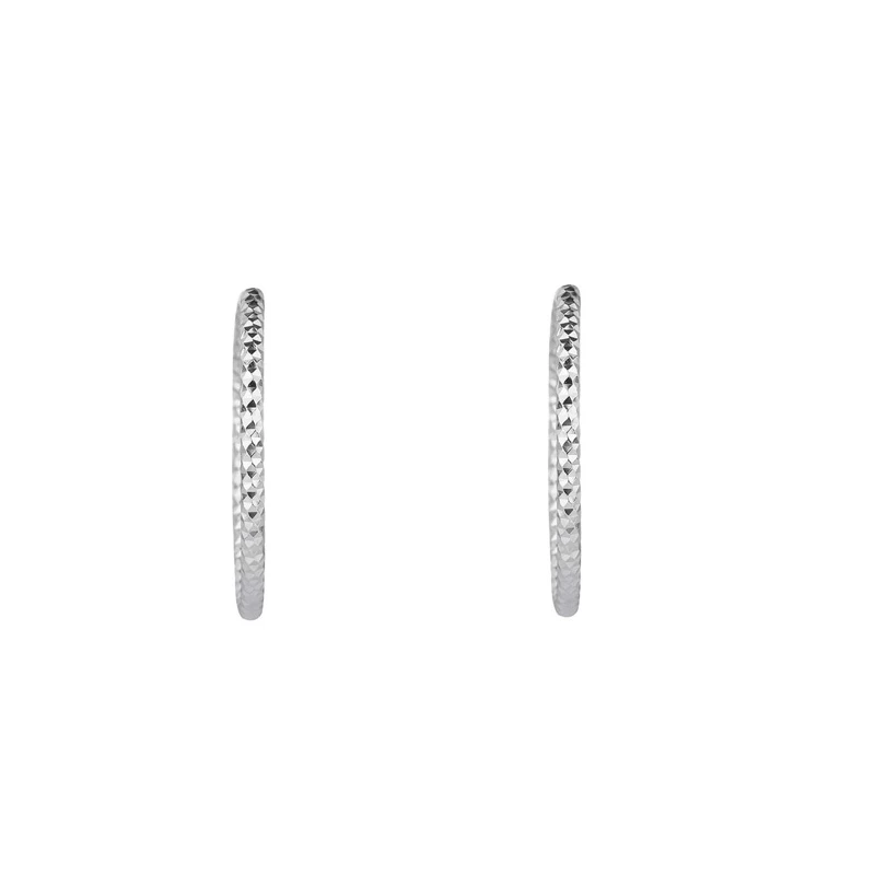 Stříbrné kruhové náušnice se vzorem. Náušnice kruhy vyrobené ze stříbra 925/1000. Povrch náušnic je porhodiovaný. Úprava náušnic rhodiováním jim dodává jasnou barvu s leskem, zvyšuje odolnost povrchu proti poškrábání a zaručuje náušnicím dlouhodobý bezchybný vzhled. Náušnice jsou široké 2mm, vnější průměr 35mm.