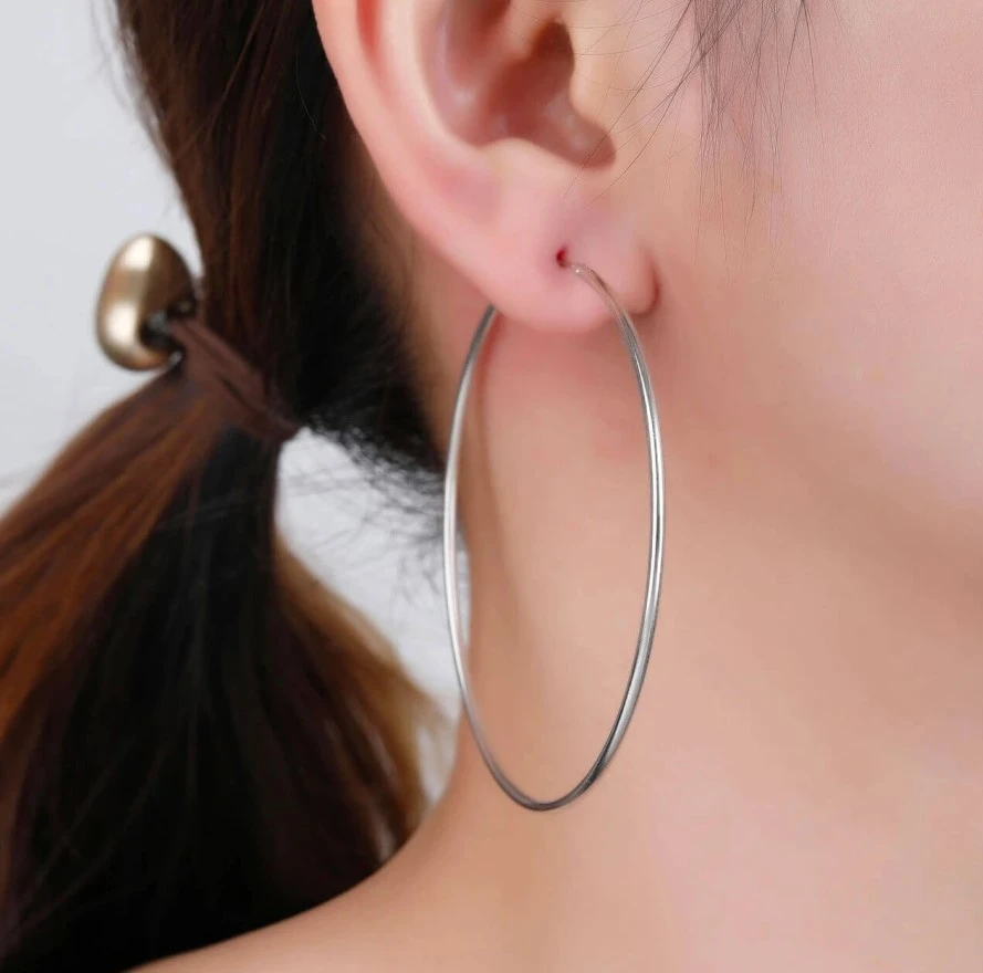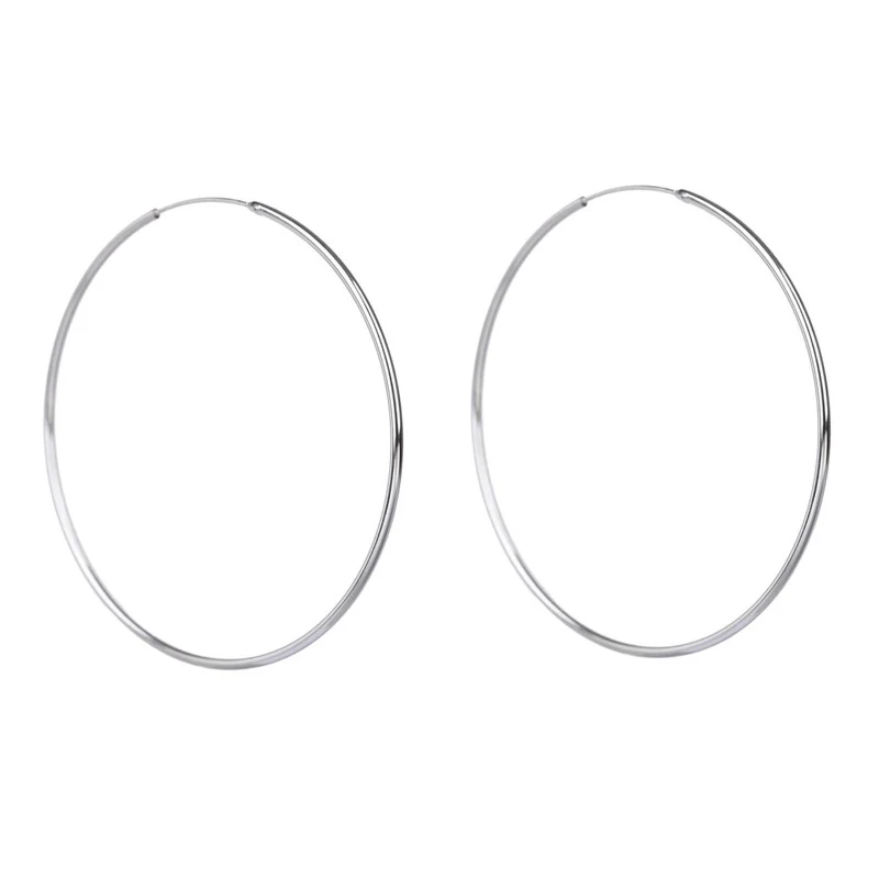 Kruhové náušnice vyrobené ze stříbra 925/1000. Povrch náušnic je porhodiovaný. Úprava náušnic rhodiováním jim dodává jasnou barvu s leskem, zvyšuje odolnost povrchu proti poškrábání a zaručuje náušnicím dlouhodobý bezchybný vzhled. Náušnice jsou široké 1,6 mm, vnější průměr 65 mm.
